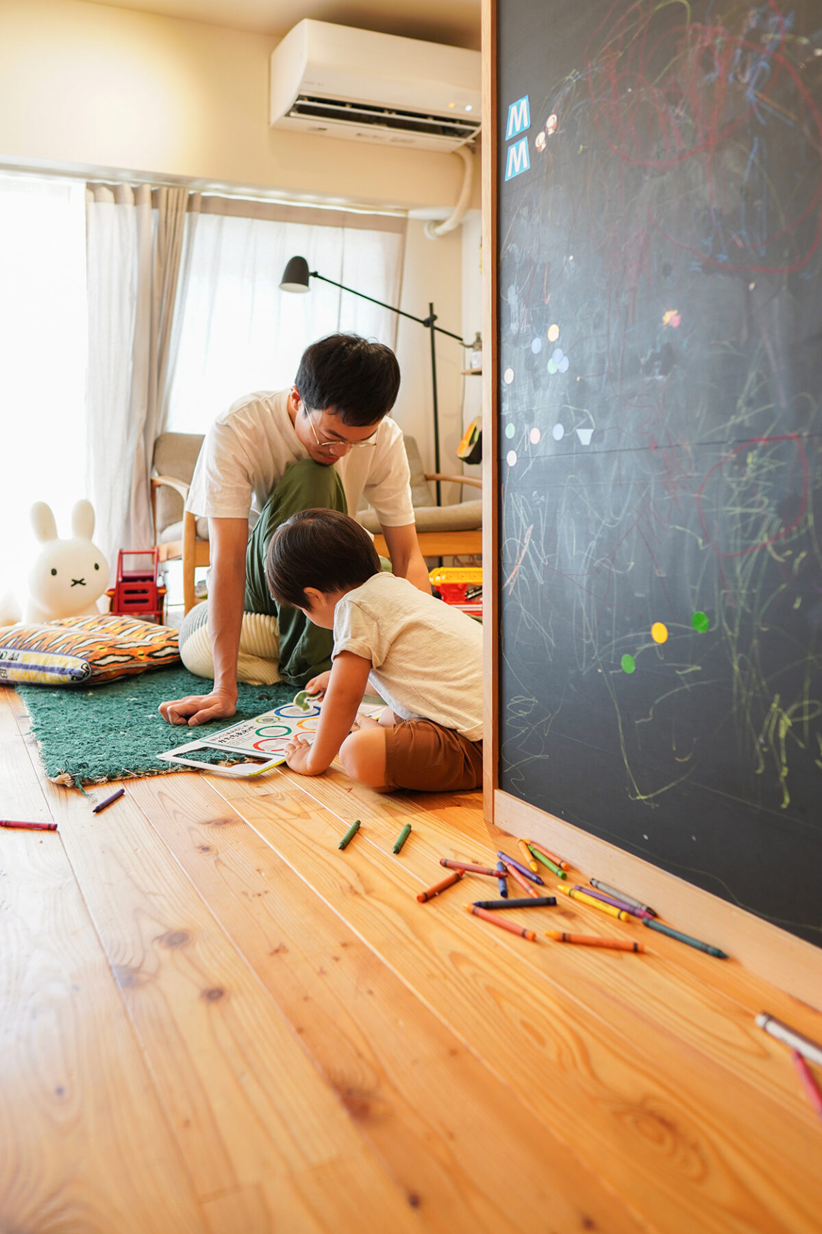 友人を自宅に招くことが多いA様。以前は3DKと細かく区切られた間取りでしたが、大人数でも過ごしやすいように、リビングを広くとった1LDK+WIC+ワークスペースへとリノベーションしました。「個室よりも、長く過ごすLDKを広くとりたかったんです」とご主人。こだわった珪藻土の壁に、ご主人の趣味のオーディオや、以前の住まいでも飾っていた絵が映えます。「予算を掛けてでも珪藻土がいいなと思ってできるだけ塗り壁にしました。フラットな中にも照明が当たったところの素材感がいいですし、乾燥する日は水を吹きかけると上手い具合に調湿してくれていいんですよ」(ご主人)。空間の広がりを感じられるよう、リビングダイニングとキッチンとは大きなカウンターで仕切りました。「以前の住まいではキッチンに仕切りがなく、キッチンでいたずらをしないか心配で目が離せなかったんですけど、今はリビングダイニングから離れたので、子どもと過ごすことが楽になりました」と奥様。下の階は店舗のため、息子さんが走り回っても気兼ねすることなく、のびのびと子育てを楽しんでいらっしゃる様子でした。