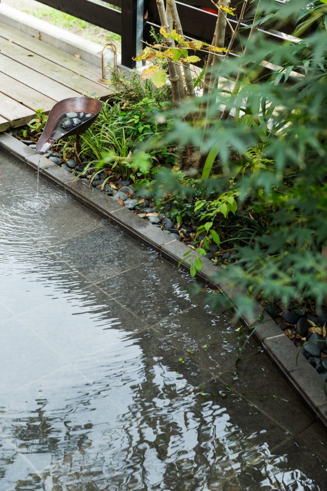 水の揺らめきが反射してダイニングの天井に映り込む様はとても贅沢です。夏はデッキとミズニワでBBQやお酒を楽しんだり、水を張った水盤に足を入れればひんやり夕涼みもできます。