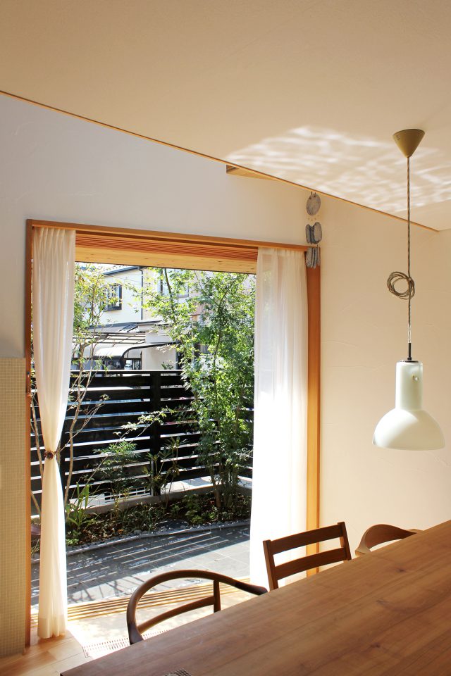 家族が暮らす家に、美しい水面が眺められる水盤をつくりたい!そんな一言から計画がスタートした「ミズニワハウス」。陽がたっぷり入る吹き抜けのあるダイニングスペースには、暮らしを楽しくする薪ストーブ、揺れるカーテンの先には家族の思い出の場となった水庭が広がります。