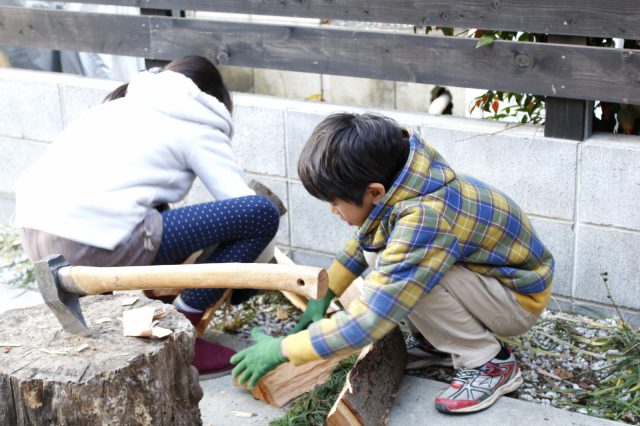 薪ストーブのある生活になり、薪割りは男の趣味のひとつに。庭に設置した薪棚には3年先に使う薪まで乾燥されながら出番を待っています。