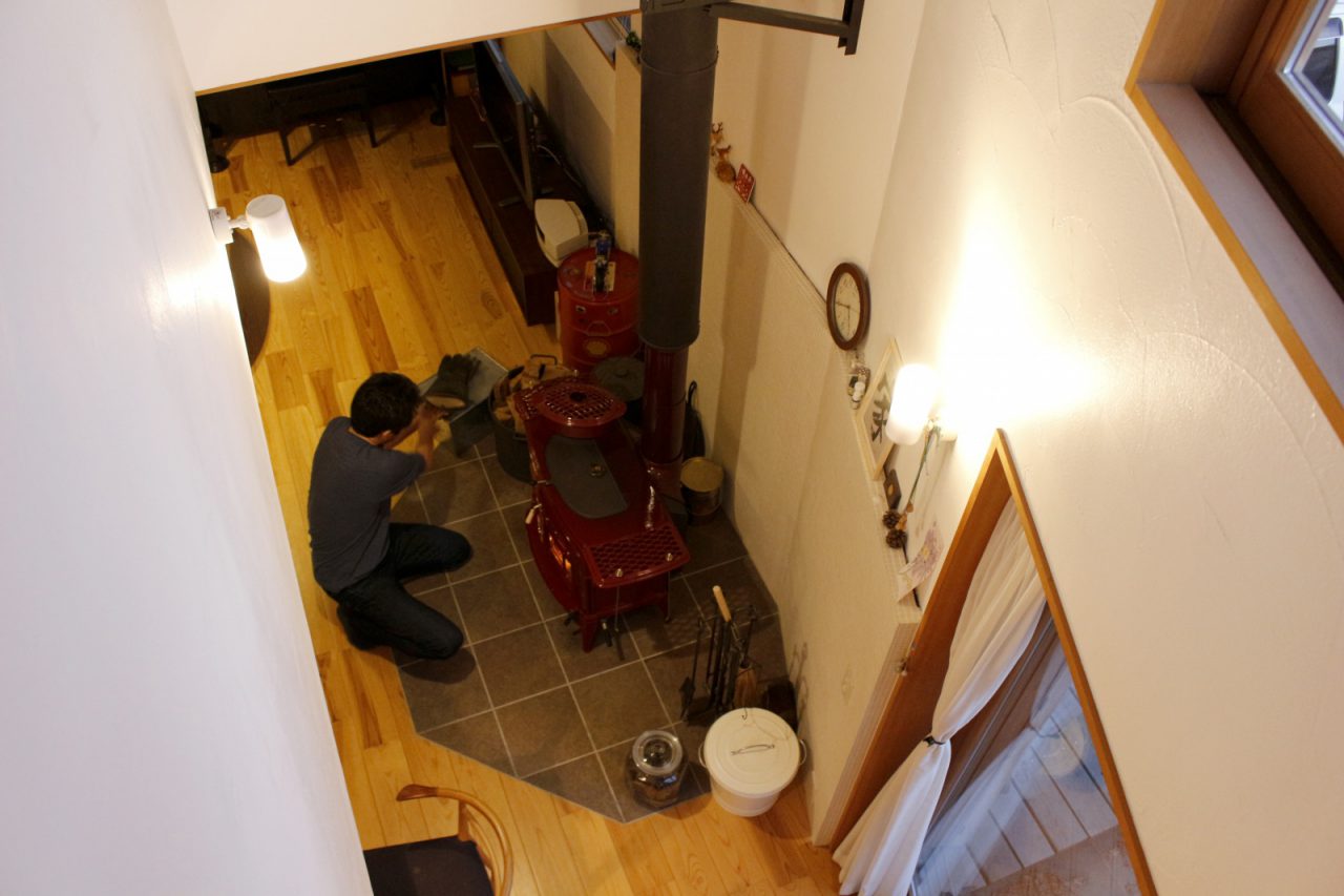 「お客さまの家で実際に見て魅力にハマった」という薪ストーブ。子どもたちが森で集めてきた松ぼっくりを着火剤にして火を点け、温度が上がってくると、ストーブ本体の赤い色が濃く変化します。「ピザ・焼きリンゴ・ホイル焼、おでんの保温で使ったりもできますよ」と奥さま。
