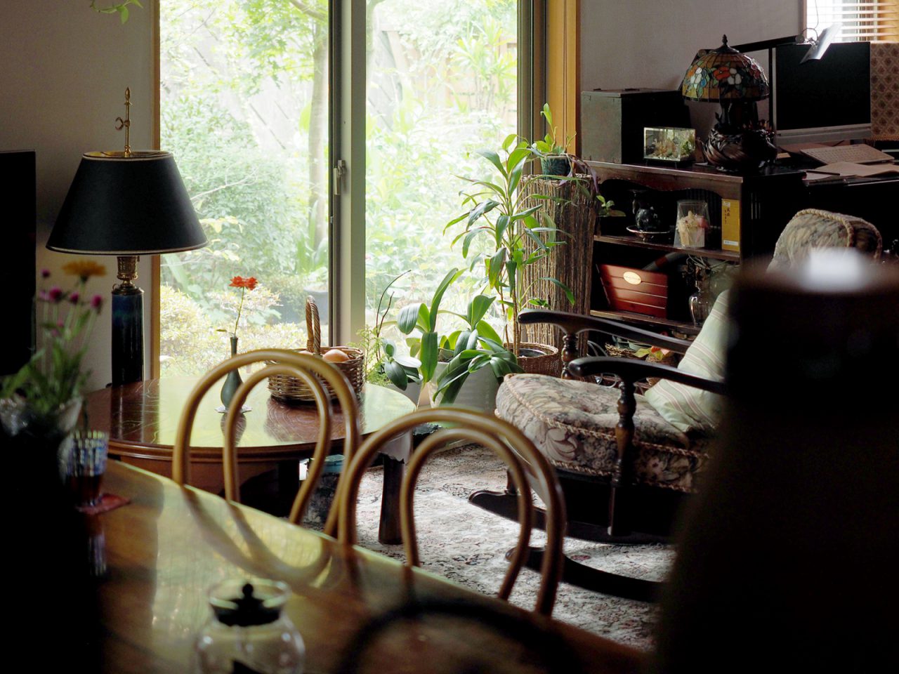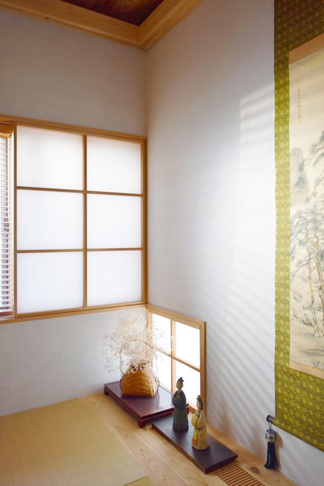 住まいを設計したのは、建築家の市川淳さん(市川設計)。「間取りや素材の希望はもちろん、ギャラリースペースやまちとのつながり。あと、週に一度お友達が遊びに来るので、みんながくつろげる空間にできたら……そんな色々な想いを市川さんにお話ししました。」と奥様。そうして何度も打ち合わせを重ね、Ⅰ様のご要望をもとに立地を活かした市川さんならではの設計、さらに職人さんたちの丁寧な手仕事により、自然素材に囲まれた現在の素敵な住まいができあがったのです。玄関から家の中へ入るとすぐにリビングが広がり、"家族が帰ってきたら顔を合わせられる"という動線も自然と取り入れられていました。「家にお友達が来ると居心地が良いみたいで、みんな時間を忘れてゆっくりしていますよ」とにっこり。窓の外にはご主人がお手入れされているお庭があり、ダイニングテーブルの席から眺める美しい緑の景色は格別です。
