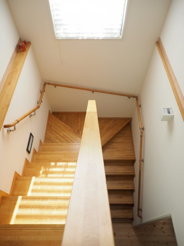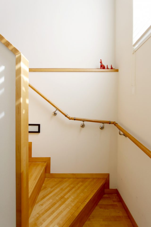 リフォーム前は床暖房を使用していたというY様ですが、現在は無くても充分、とのこと。「ここ、全然違うんですよ」と奥様に案内され、無垢の床と以前のフローリングが残る階段を触り比べてみると、表面の暖かさの違いに改めてビックリしました。
