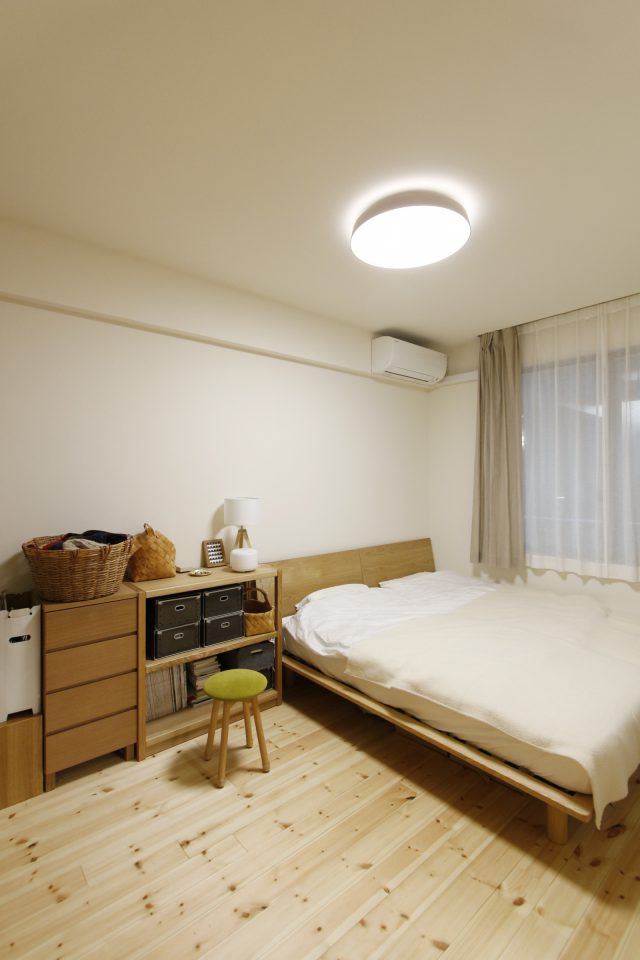 床は既存の木製フローリングにパイン無垢材を接着張り。廊下の扉はすべて、明るい色の建具に統一されていて、玄関を入ってすぐにやわらかな印象に包まれます。家族の共有スペースである居間は暖かく広々。奥様選りすぐりの小物やグリーン、北欧雑貨などがセンスよくしつらえてありました。