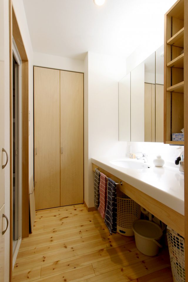 収納可能な室内用物干し竿や可動式の照明用ペンダントサポーターなど工夫がいっぱいのY様のリフォームですが、一番の見どころは造作家具。天井まである大きな玄関収納や、洗面台、棚、キッチン。職人さんの手しごとで、幅も高さも物がすっきり収まるように作られています。以前は配膳できるくらいの小さな窓しかなかったというキッチンは、あえて仕切りを無くしたことで一体感が生まれ、広く感じるそうです。「ホントこれいいです!話をするのにのぞき込むのはちょっとさみしい。かといってアイランドキッチンにするほどではない。ある程度の仕切りがあるくらいがちょうどいいんですよ」とご主人。台所にいるときも家族の様子がよく見え、居間からもキッチンに立つ奥様の姿がよく見える……自然とコミニュケーションの取れる距離感が生まれています。