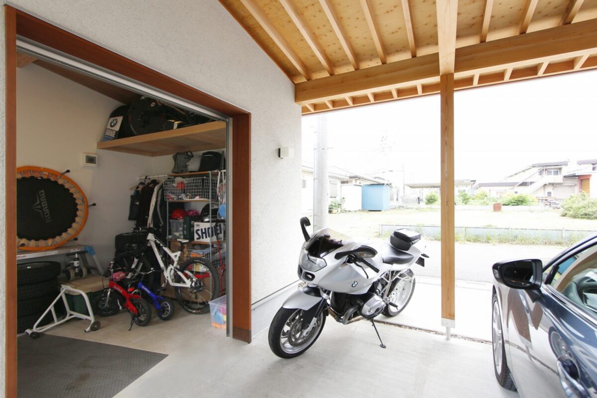 バイク好きのご主人はバイクを収納したり室内で作業できるようなガレージを希望。