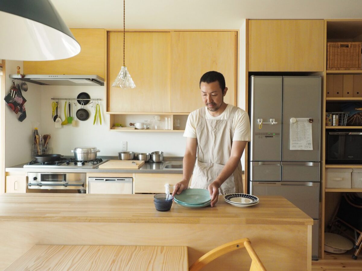 *キッチンの位置を移動し、和室を6帖→4.5帖に削ってリビングを広く。和室は小上がりにし、収納できる造作家具を多めに設置。