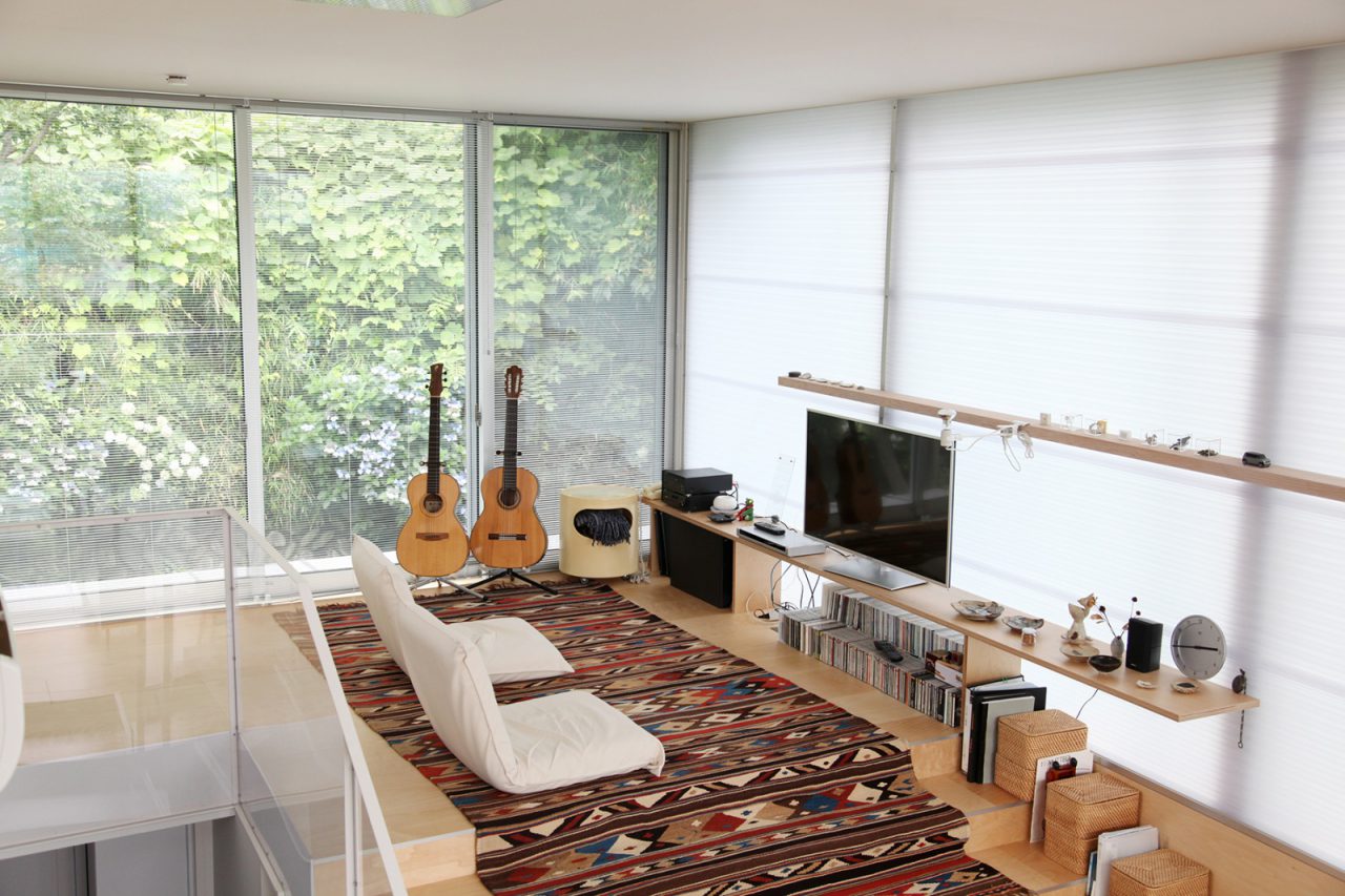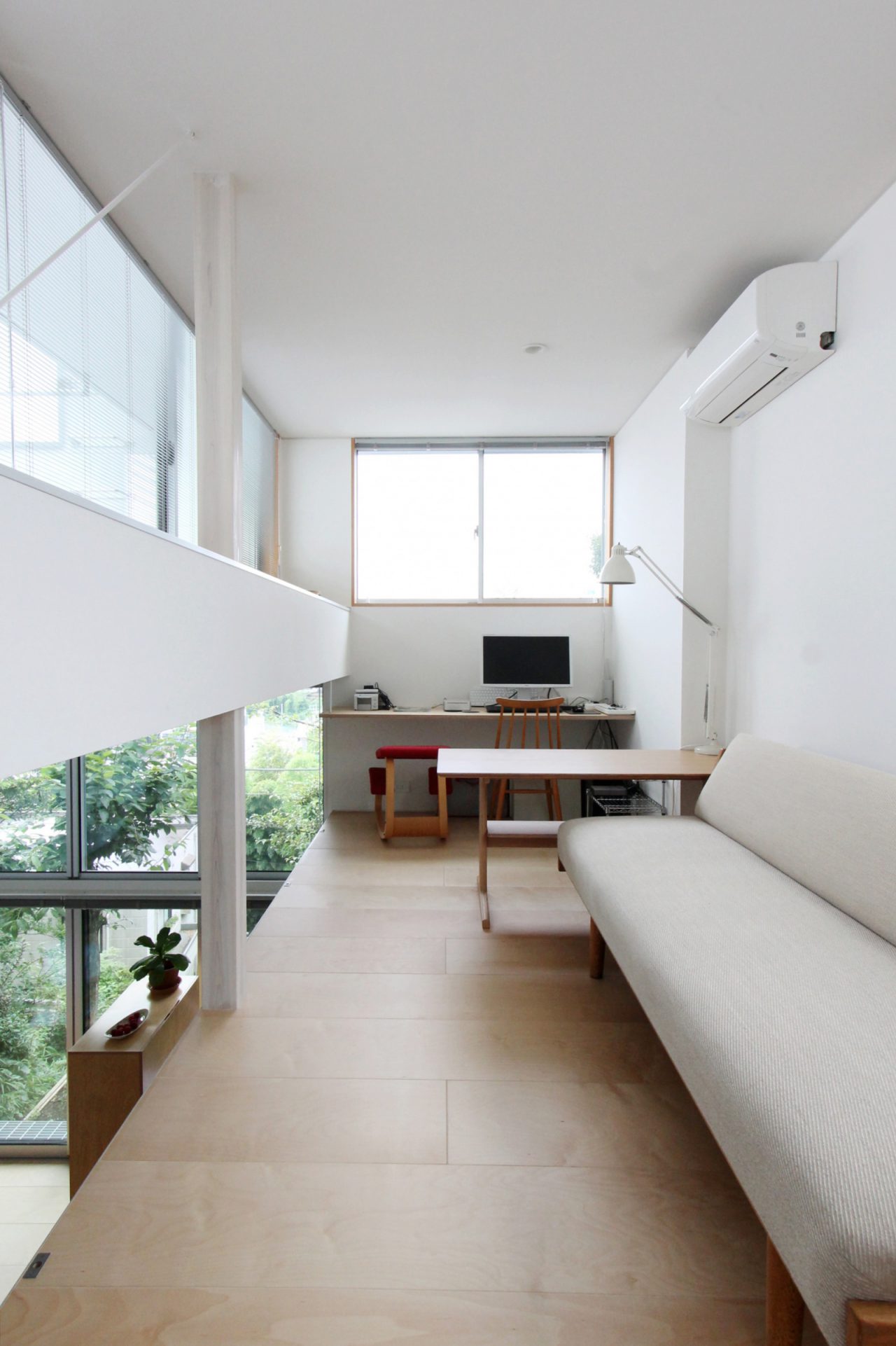 リビングダイニングを見下ろせる仕事場。必要に応じて下の部分を閉じることもできます。壁側にあるハンス・J・ウェグナーの白いソファは、奥さまが一人暮らしをされていた頃からずっと大事に使っている家具です。永く使っているのにとても綺麗なソファ。使い手の丁寧さ・気持ちに家具も応えているかのようでした。
