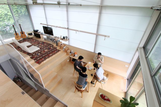 玄関から続くゆるやかな勾配の階段を登っていくと、壁一面に大きな窓のある空間が広がっていました。窓からの景色、絶景です。さらに寝室、ダイニング、リビング、ワークスペース……とスキップフロアで各部屋がつながり、それぞれが仕切られること無く螺旋状に続いているのです。階段をのぼるたびに、まるで外国の山岳都市の街並みの中にいるようなトリップ感!……胸が高まります。壁にはほんのり透け感のあるポリカーボネート。夜になると室内からぼんやりと灯りがもれ、外から見たときにとても綺麗に見えるそうです。内も外も両方楽しめるお住まい。念願の家を建てたA様ご夫婦は「ゆったりとした空間で過ごすようになり気持ちにも余裕ができました。あとは毎日家に帰ると旅に来たような気分になるのも嬉しいです」と新しい住まいでの暮らしをお二人で楽しまれているご様子でした。