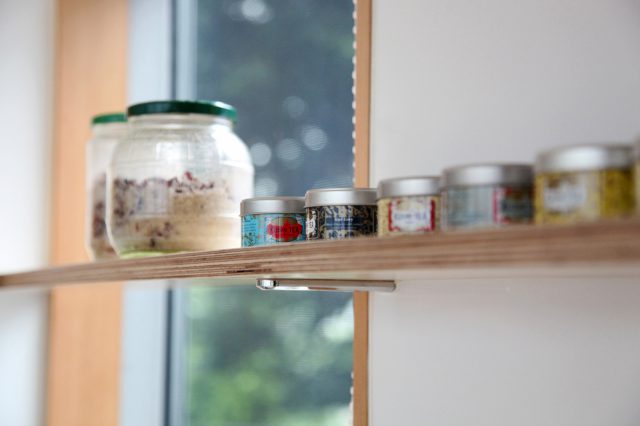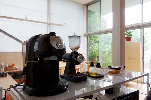 自宅でパンを作ることもあるという奥さま。「キッチンが広くなったので、生地もどーんとおもいっきり広げられるのが良いです」と笑顔に。以前の家で使っていたMUJIのラックもぴったり収まるように設計されていました。キッチン奥のパントリーは階段状になっていて、食品や小物を置くスペースとしても便利。「段差になっているところに足をかけて棚の上のものをさがしたり、お料理している途中でちょっと一息つきたいときに座れるのが嬉しいです」と奥さま。他にもオートミルやコーヒーメーカー、可愛い紅茶の缶が並んでいて、ティータイムが待ち遠しくなるようなキッチンです。