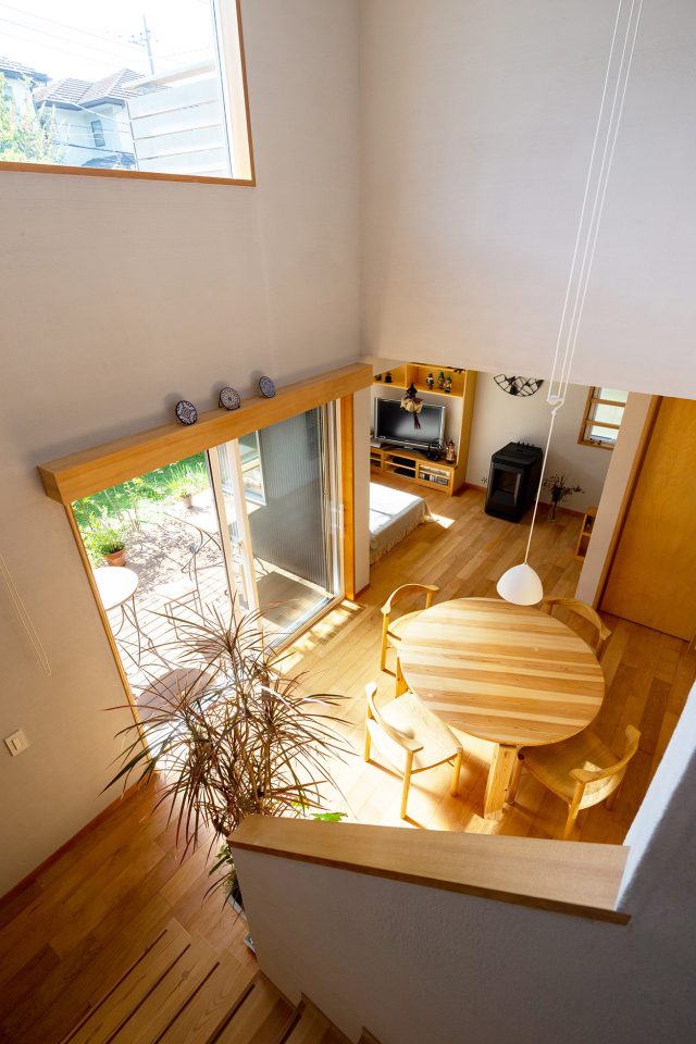 吹き抜け空間やテラスデッキを、籠もれる趣味のスペースや個室が囲むS様邸。島田さんが「1階だけでも暮らせるように」と将来も踏まえて提案した当初の案から、ほぼ変わりません。変更はリビングの畳をなくしたこと。その代わりに置いた、足を投げ出してくつろげる島田さんオリジナルのソファにゴロンとなり、テレビを見るのが奥様お気に入りです。窓はソファの背と同じ高さで、座っていてもお庭を大きく眺めることができます。日当たりの良いお庭では、ご主人がハツカダイコンやサニーレタスなどをプランターで栽培。収穫した野菜が食卓を彩ります。また、寒かったという前の住まいとは打って変わって、OMソーラーやペレットストーブのお陰で、冬も暖かく快適にお住まいだそう。ペレットストーブは、別の楽しみにも活躍。上部にヤカンを置いてお湯を沸かすと、熱燗をつくるのにちょうどいい温度になるのだとか。他にも、壁裏の柱に打たれた釘を探して磁石で物を飾るなど、暮らしをより豊かにする工夫がたくさん。ものづくりがお好きなS様らしくお住まいです。