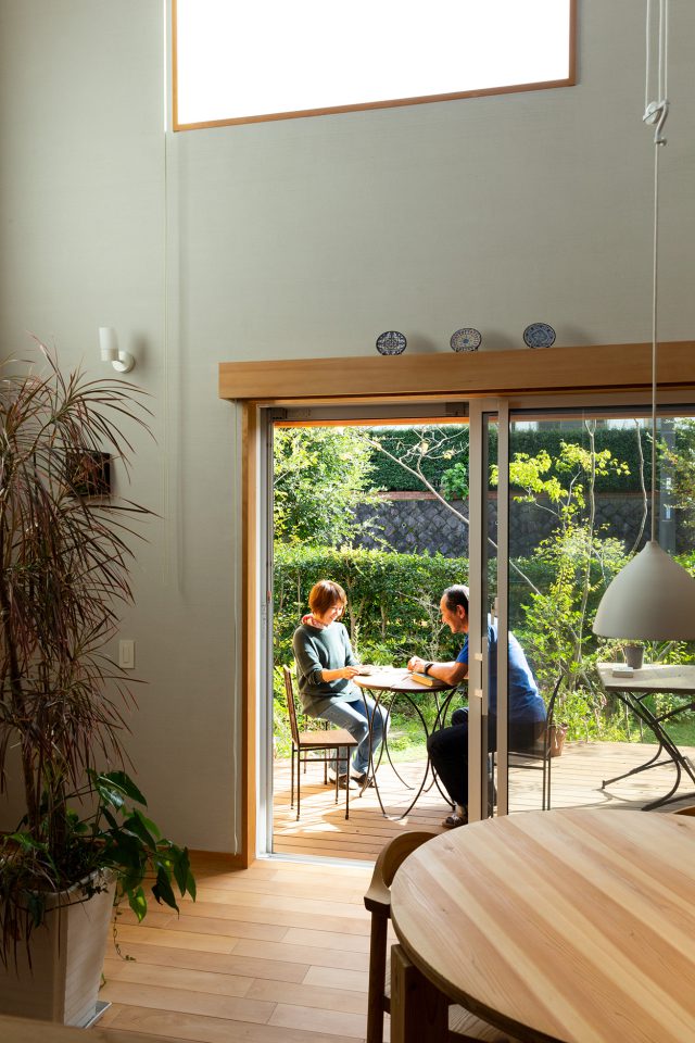 今回ご紹介するのは、取材日に1年点検を行ったS様ご夫婦の住まい。日当たりが良く、お庭の植栽が馴染んでいます。ジューンベリーの実を採ったり紅葉を眺めたり、家庭菜園をしたりと、四季の移り変わりを満喫。ご夫婦ともに趣味を多くお持ちで、刺繍など手仕事が好きな奥様が新聞広告で見かけた「つむじ市」をきっかけに相羽建設と出会いました。家づくりの予定はありませんでしたが、会場のモデルハウス「つむじ」を訪れて「これから住みたい空間が見つかったんです」と奥様。OMソーラー※も決め手に。慣れ親しんだ所沢で土地探しからスタートしました。相羽建設や建築家の事例を探して、理想とする住まいのイメージに近かった建築家の島田貴史さんに設計を依頼することに。S様ご夫婦の今後の楽しみが詰まった住まい。そのみどころや現在の暮らしぶりを伺いました。