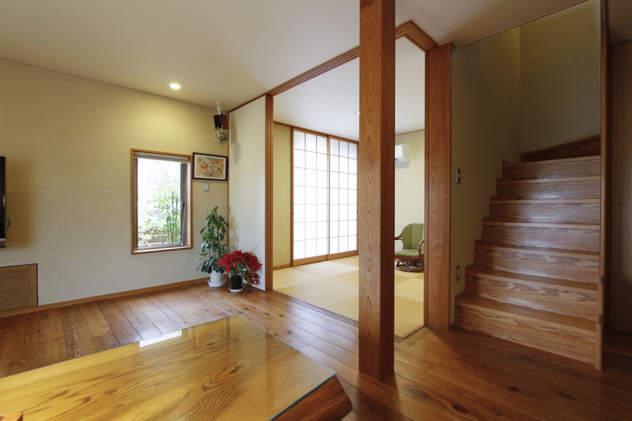 玄関を入ると広がる、明るい土間と吹き抜けが開放的なリビング。真さんが選んだケヤキの大黒柱が来客を出迎えます。早川家は一枚板の座卓を囲う、床座の暮らし。夫婦揃ってお酒が好きなことや、人を招くことが多いライフスタイルを反映した間取りです。その他、家事動線がワンフロアで完結するよう田中さんに依頼しました。キッチン脇、1階のファミリークローゼットに洗濯機が置かれ、家事時間を短縮。家族が普段使う荷物はファミリークローゼットに、季節外の物は2階のWICにすっきり収まっています。暮らはじめて11年目を迎えた感想を「居心地がいいですね。掃除をして、外をぼーっと眺めるのが好きな時間です」と照美さん。特に寒い冬の朝はOMソーラーの力を感じるそう。また、帰宅するとまず靴下を脱ぐのが早川家のお決まりです。年中さらっとした快適な環境で、子どもたちは健やかに育っています。