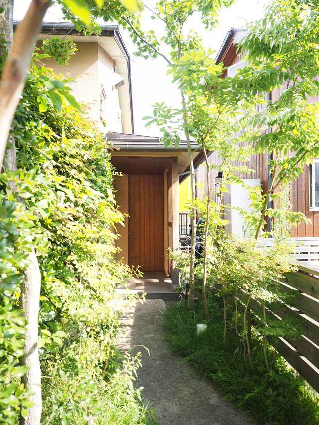 新築の際、設計をお願いしたのはN設計室の永田昌民さん。『動きのある家にしたい』という要望を受けて永田さんが描いてくださったプランがスキップフロアの家。玄関から階段を下りて1mほど地面に潜るようにリビングがあります。そうすることで建物の高さが低く抑えられてこじんまりとした見た目の良さと、北側に建つ家の日射を少しでも遮らずに済むという利点もありました。また、リビングの窓の高さはちょうど庭とおなじくらい。見上げる庭の木々はより一層大きく見え、地表を覆う小さな草花が寄り添ってくれているような穏やかな時間が流れる空間になっています。