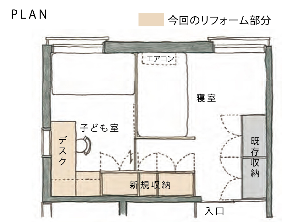 「子どもと川の字で寝る暮らしが名残惜しく、広い空間を間仕切ることにも抵抗があってリフォームを延ばし延ばしにしていたんです。でもいざ完成してみると「リフォームしてよかった!」というのが素直な感想。子どもが巣立ったら隣の部屋も私がもらおうと思っています」と奥様。子どもの成長は嬉しくも名残惜しくもある・・・その気持ちに非常に共感しつつ、それでも「よかった!」といってもらえて、心がほっと温まりました。