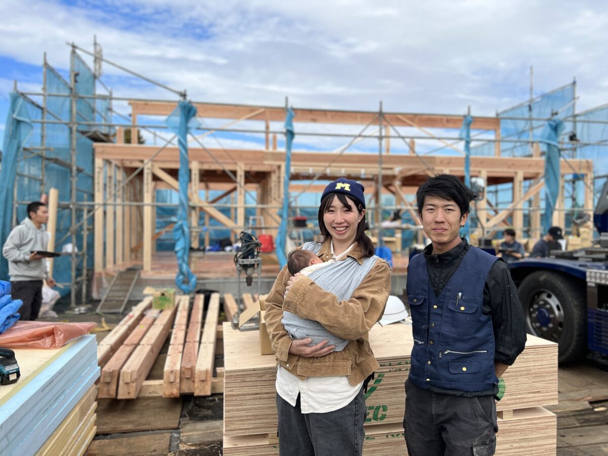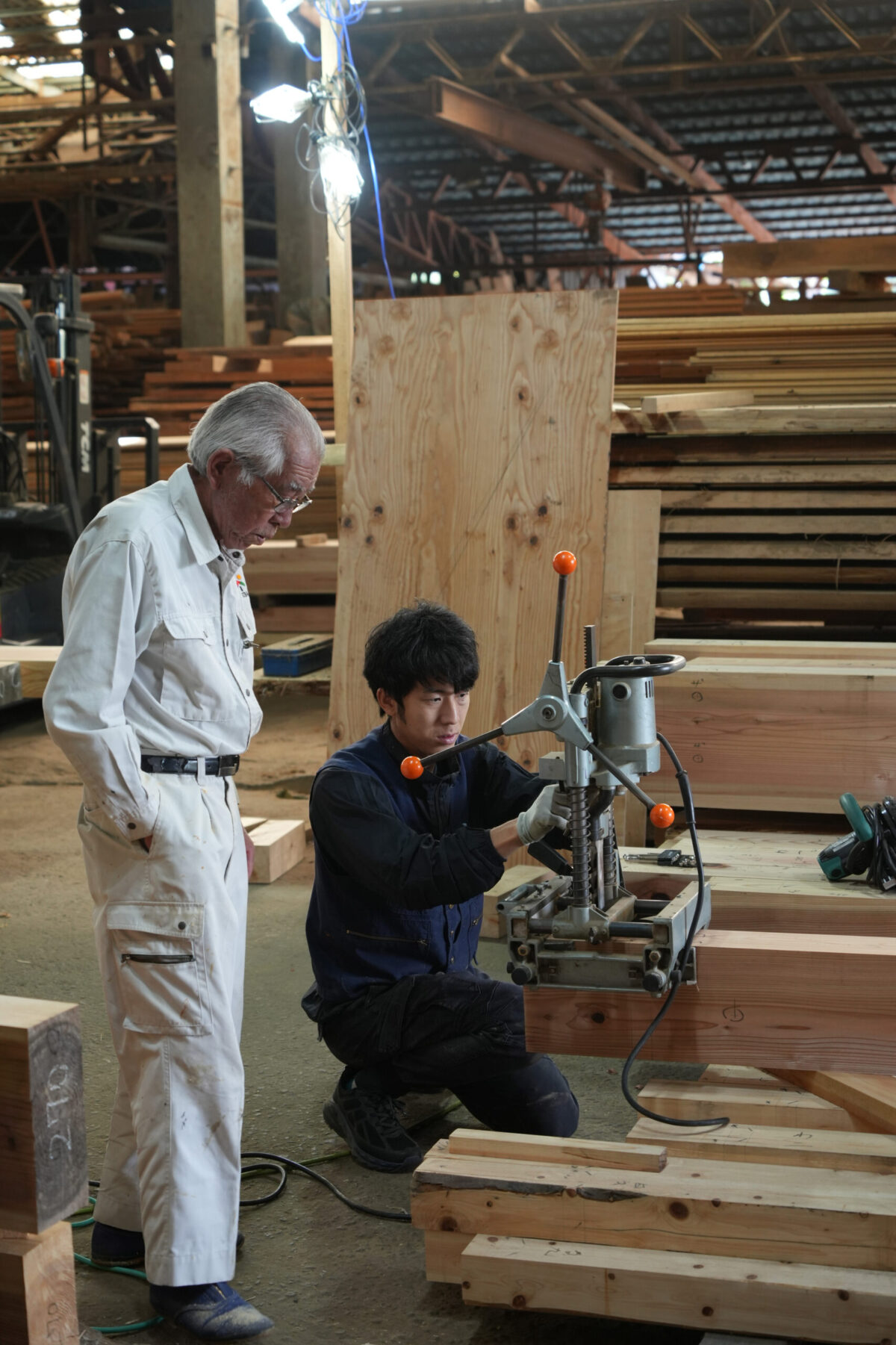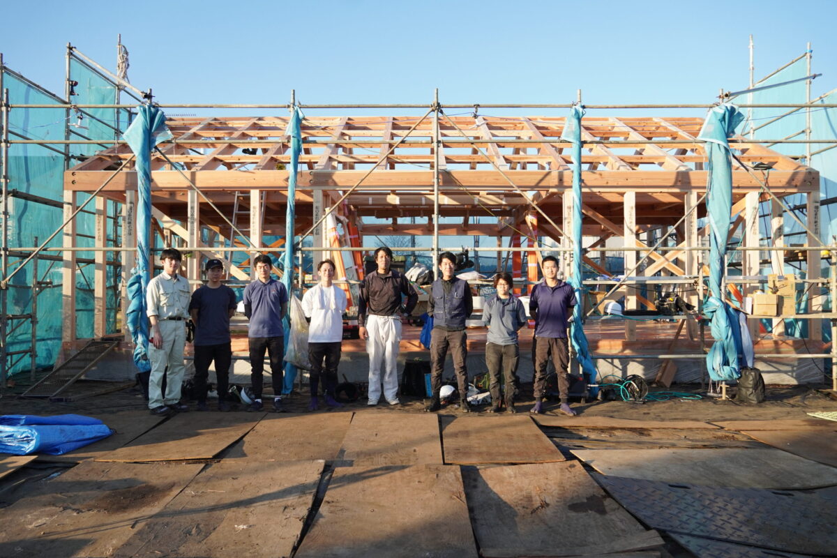 応用の効く技術や手法を学ぶため、小林大工が手刻みでの家づくりに挑戦しました。教えてくれたのは大ベテランの秋山大工。墨付けという木材に線を入れる作業は小林大工が行い、刻みと言われる木を切る作業を秋山大工が担いました。「手刻みは建ててみないと正しいかどうか分からず、常に緊張感がありました。工期が迫る中で集中して追い込んだことが印象に残っています」と小林大工。手刻みの他にも断熱性能の強化にもチャレンジしており、UA値0.31ほどの性能を実現しています。