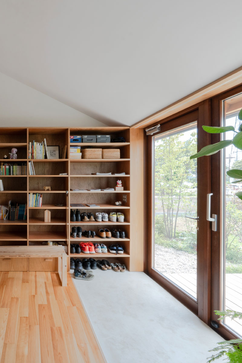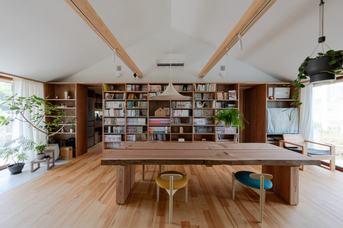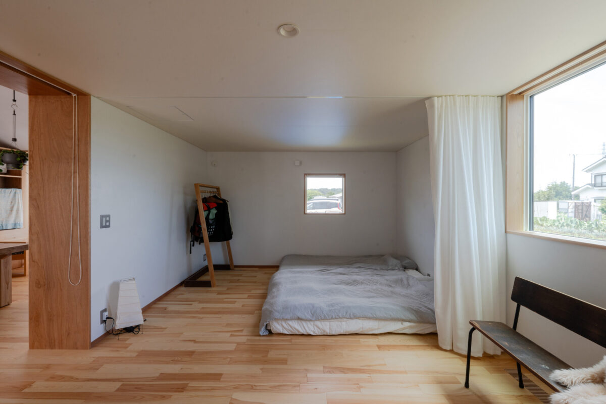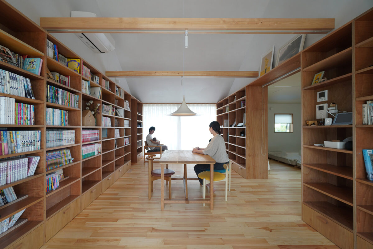 家の中央に位置するリビングダイニングいっぱいに設置された本棚は、本や漫画が大好きな樋口さんらしい設計です。「家は、家族の暮らしの箱でありながら、家族の成長や日々の暮らし、慌ただしさも含めて受け止めてくれるような空間を思い描いて設計しました」と樋口さん。ゆったりとくつろぐ空間でありながら、シンプルな間取りならではの汎用性、家族の暮らしに合わせて変化させられるおおらかな空間が魅力的です。一番お気に入りの場所をお二人に伺うと、なんと揃って『リビング北側の畑に面した吐き出し窓の前』との回答。畑越しに朝焼けを見る時間がお気に入りだといいます。「娘もこの窓から雨をじっと見ていました。時間や季節の経過を感じられる場所です」と樋口さん。リビングと、ロールスクリーンで仕切ることができる子ども部屋は、娘さんの成長に合わせて壁で仕切ることも想定されているおおらかな空間。水廻りや収納はコンパクトに集約して、生活の場とくつろぎの場が家の東西で左右対称に分けられています。ダイナミックな間取りも、にしたまの家の大きな特徴です。