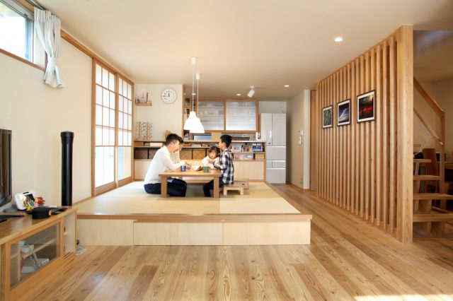 「いわゆる一般的なテーブルではない形がいいなぁと思っていたんです。こうすれば足も入れられるし、畳スペースもあってゴロンと昼寝もできて、すごく気に入っています」と笑顔でお話し下さったご主人。