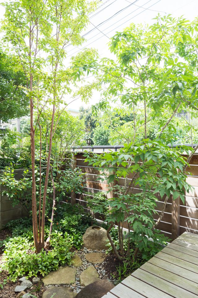 相羽建設の建築士である中村健一郎さんの自邸。自らが設計し、奥様と娘さんの3人でお住まいです。「建築士の自邸」と聞くと、どんなお宅なのか気になるところですが「特別なことはしようとは思わなかった」と中村さん。目指したのは“ちょっとだけ格好がつく普段着の家”だそう。車を持たずに駐車場のスペースに庭をつくろうと、造園家の小林賢二さんに庭づくりを依頼しました。