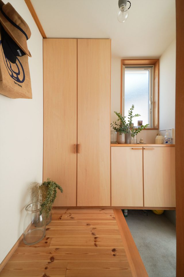 以前は近くのマンションにお住まいでしたが、ご主人のご実家を引き継ぎ、新築されました。「木に囲まれている感じで質感が気持ち良く、裸足で過ごしています」と奥様。OMソーラーのお陰で、冬に底冷えしないのも良かったそうです。奥様はフローリスト・キャンドルアーティストで、デパートや地方で展示会を開く他、相羽建設のイベントに出品くださったことも。展示用に作った大きなアレンジメントや花びら入りのキャンドルなど、奥様の作品が家の至る所に。シンプルな木の家が、すっかりO様の色に染まっています。「友達が遊びに来ると、綺麗でいいねって言われます」と娘さん。竣工後に玄関前や庭先にご家族で植えた植物を室内に生けて、家もお庭も楽しんでお住まいの様子です。家づくりのこだわりや、暮らしぶりなどを伺いました。