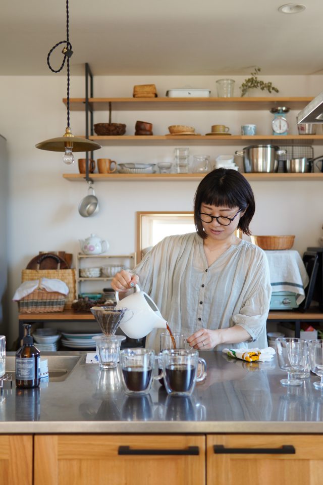 玄関を上がって引き戸を開けると、お花とキャンドルが優しく香るLDKが広がります。奥様が教室を開くために、大勢が集まりやすいLDKを希望されました。より広さを確保するためにLDKを2階にする案も挙がりましたが、ハーブやお花を植えるお庭との繋がりを考えて、1階がLDK、2階が水廻りと個室という間取りに落ち着きました。LDKから延びるようにウッドデッキを作ったり、オープンな造りのキッチンにしたりと、開放感を高めています。大きなダイニングテーブルは、奥様の創作や教室、食事、団欒と幅広いシーンで活躍。ご主人はダイニングチェアにもたれて、大好きなお酒を飲みながらテレビを見るのが至福のひと時だそう。取材後には「こうやって並べるとかわいいね」と奥様と娘さんが会話しながら一緒にコーヒーを出してくださいました。キウイ酢を作ってゼリーにアレンジするなど、娘さんもお料理好き。「キッチンが広いので、二人並んで立てるんですよ」と、とても嬉しそうな奥様の笑顔が印象的でした。