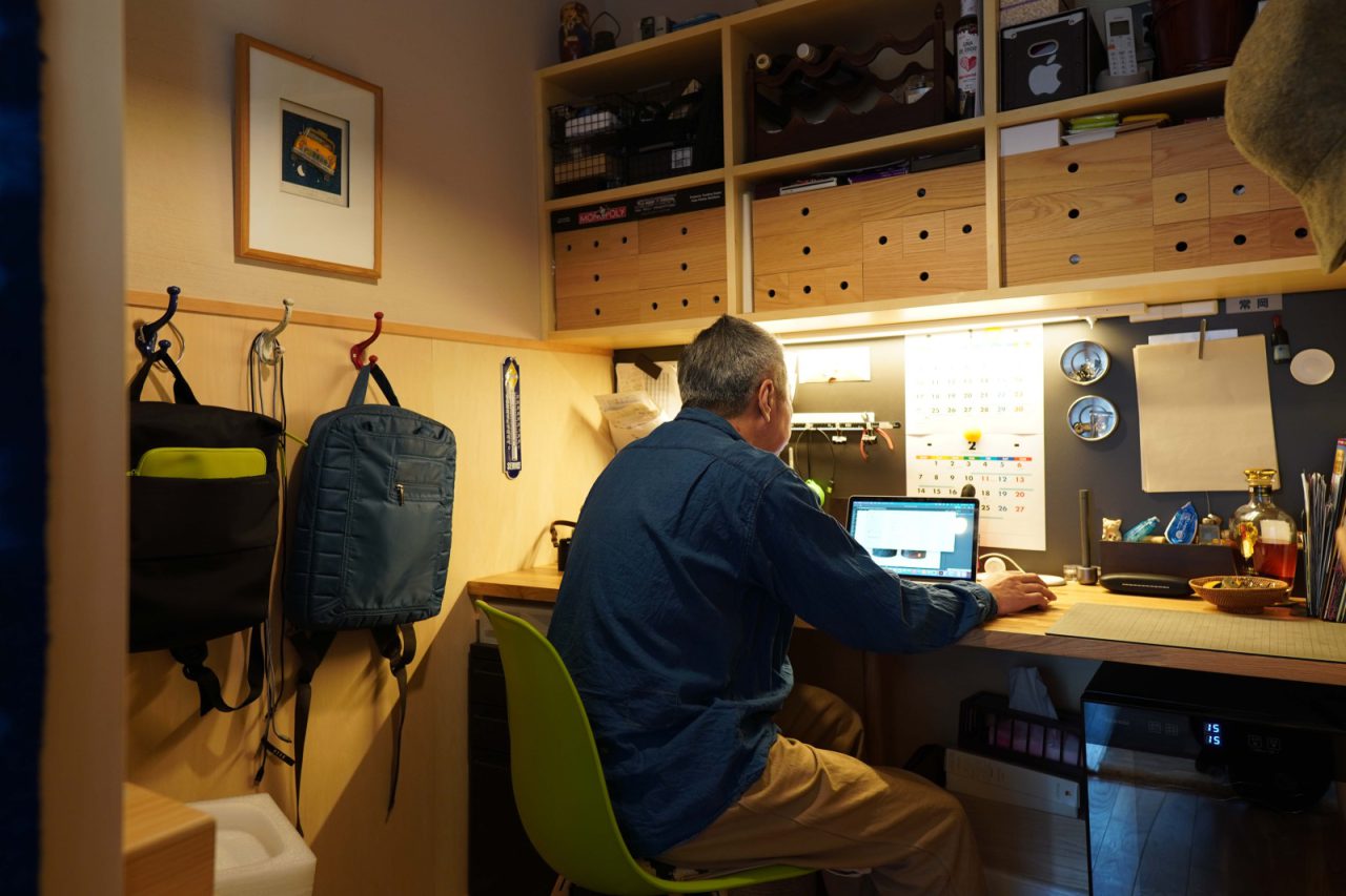 LDKの奥にはご主人の書斎が。足元にはワインセラーも完備されていて、好きなものに囲まれた空間はまるで秘密基地のよう。あいばのリフォームとメンテナンスの拠点である、あいばこで見かけた扉を気に入ってくださり採用しました。開けている時も綺麗に収まり、低めの扉によってダイニングと書斎を緩やかに仕切ることができます。