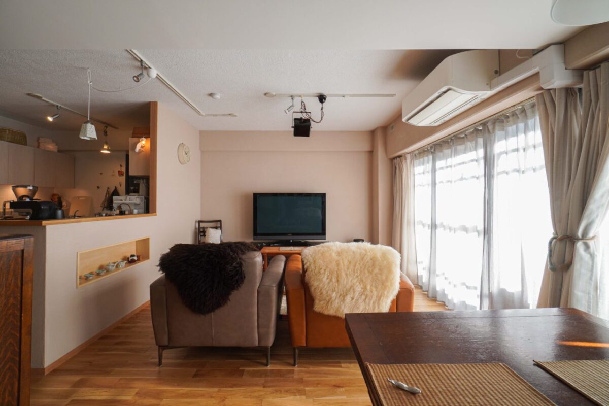 今回ご紹介するのは、25年住まわれている団地をリノベーションされたT様邸。「せっかく相羽建設にお願いするなら、他ではできない良質な素材を使った部屋に」と、こだわり屋のT様ご夫妻ならではの空間に。リビングの壁に薩摩中霧島の左官仕上げを施したことで、「部屋の空気の質がよくなりました。料理をしてこもった空気も朝起きると感じないんです」と奥様。素材の良さを感じながら住まわれています。床材にはナラを使用するなど、ビンテージ家具とも相性の良い自然の風合いが加わりました。駅から近いことや、管理人が毎日手入れしてくれる四季の樹々が、団地の魅力だそう。長年暮らしてきたからこそのこだわりを、細部に反映させた暮らしや住まいの見どころを伺いました。