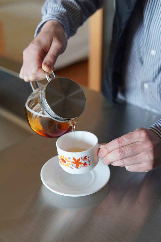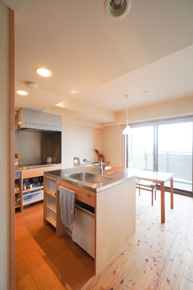 キッチンで特徴的なのが中心の作業台&シンク。コンロと離れて独立していることで回遊性が生まれています。「料理中も孤立せず外の綺麗な景色を眺められるように、お二人でお料理しても動線がスムーズに、と細かく配置を計画しました」と太田さん。マンション特有の梁を避けるレンジフードを探すのが大変で…、というリノベーションならではの苦労話も笑いながら教えてくださいました。