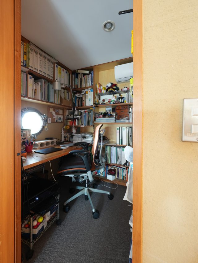 籠り感が船の客室のようなご主人様の書斎は丸窓が素敵です。「建築時、在宅勤務になるとは想像していなかったけれど、家族分のワークスペースを設けていてよかった」とご主人様。