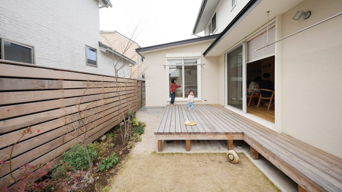 「自然素材は私たちにとって最高の贅沢。家が好きでいられることが幸せです」とご主人様。大きなデッキでお子様二人ものびのび過ごしています。