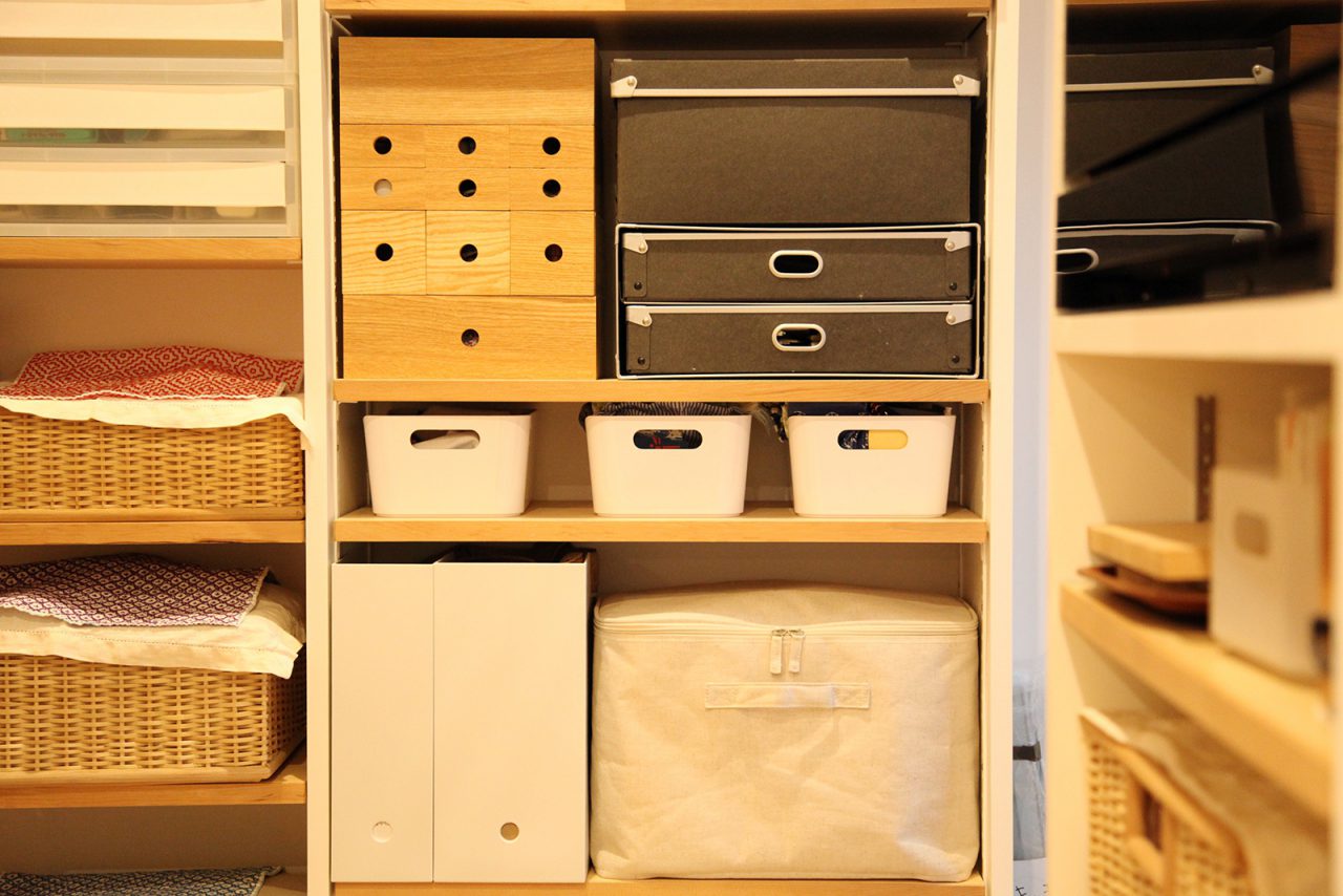 家事がしやすいようにキッチン周りは回遊しやすく、奥には書類や趣味の道具がひとまとまりになった便利な収納スペースがありました。洗濯機・乾燥機・衣類収納棚が隣り合わせになった、洗濯室の使い勝手の良さも魅力的です。