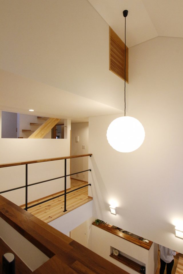 廊下を進んでいくとすぐに、パっとひらけた明るいリビングに到着!見上げると、大きな吹き抜けの空間がひろがっていました。