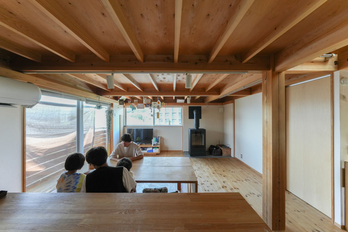 家づくりでは眺望を最大限生かすために2階リビングを採用しました。「2階の窓からは朝の光や街の季節の移ろいが広がり、とても気持ちが良いですね。リビングは自然と家族が集う空間になっています。さらに、冬には薪ストーブを囲んで過ごす時間が家族のあたたかな時間として定着しました」とM様。薪割りや火の準備も家族みんなで取り組む時間となり、日常の小さな営みがご家族の絆を深めています。また2階の薪ストーブの熱はOMソーラーの循環を使うことで、1階もしっかり温めてくれるそう。冬場はエアコンいらずで快適に過ごせるそうです。
