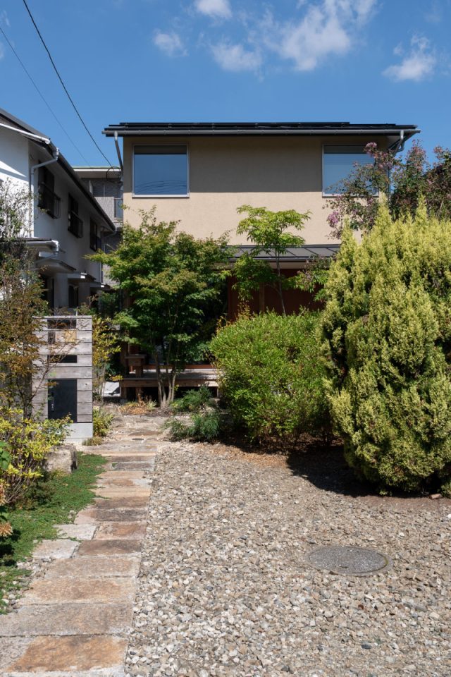 造園家の小林賢二さんのデザインによる豊かな庭では、ミニトマトやブルーベリーが2年目でジャムが作れるほどに実り、アオダモやイロハモミジ、オリーブなどが季節を彩ります。「家族みんなで庭のある暮らしを楽しんでいます」と奥様。アプローチの一部として『通りながら楽しむ、日常に溶け込む庭=ミチニワ』が誕生しました。