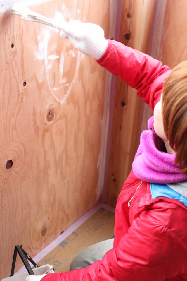 大工さんたちによる上棟後、内装工事はほぼF様と加藤さんで施工。F様は壁塗りメインでDIY。「天井を塗るのが一番大変でした。翌日腕が筋肉痛に(笑)でも自分たちでやった作業は全部楽しかったです!」とF様。家づくり中は職人さんたちの仕事を間近で見たり、上棟時のまだ屋根がついていない状態の2階で青空の下みんなでお弁当を食べたり。そして家族みんなでつくったことは、子どもたちがずっと忘れられない貴重な体験となったそうです。「あの1年はずっと家のことばかり考えていました」と笑う奥様。