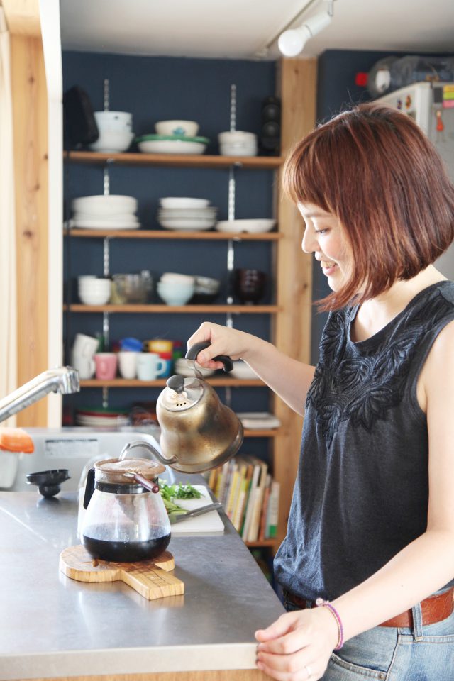 できるだけ家族の顔が見えるように流し台をリビング向きに設置しました。キッチンは流し台のシンクを特注し、それにぴったり合わせた加藤さんの造作によるもの。DIYで塗装したキッチンの紺色の壁も家の中の素敵なワンポイントになっています。