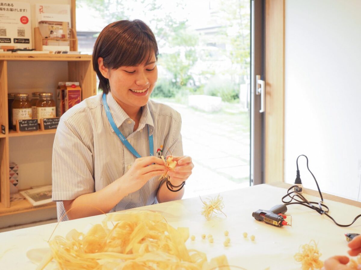 私も、かんなリボンのワークショップの講師である小川敏子さんにレクチャーしてもらいながら、実際に自分で作ってみました。