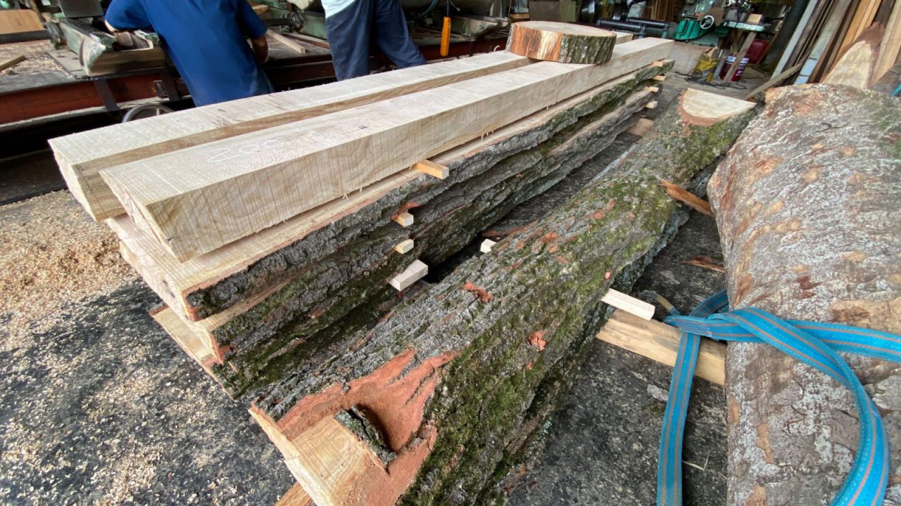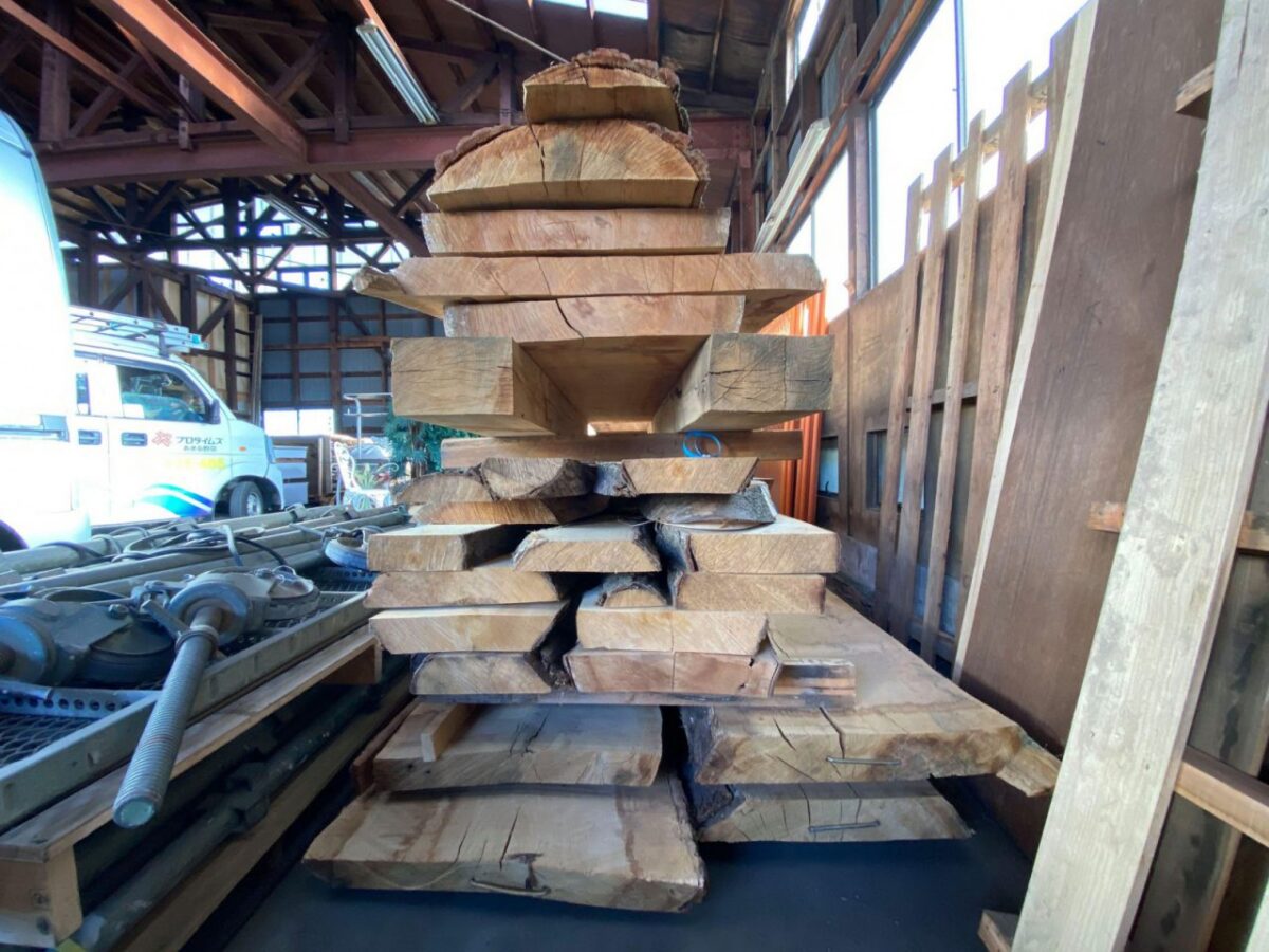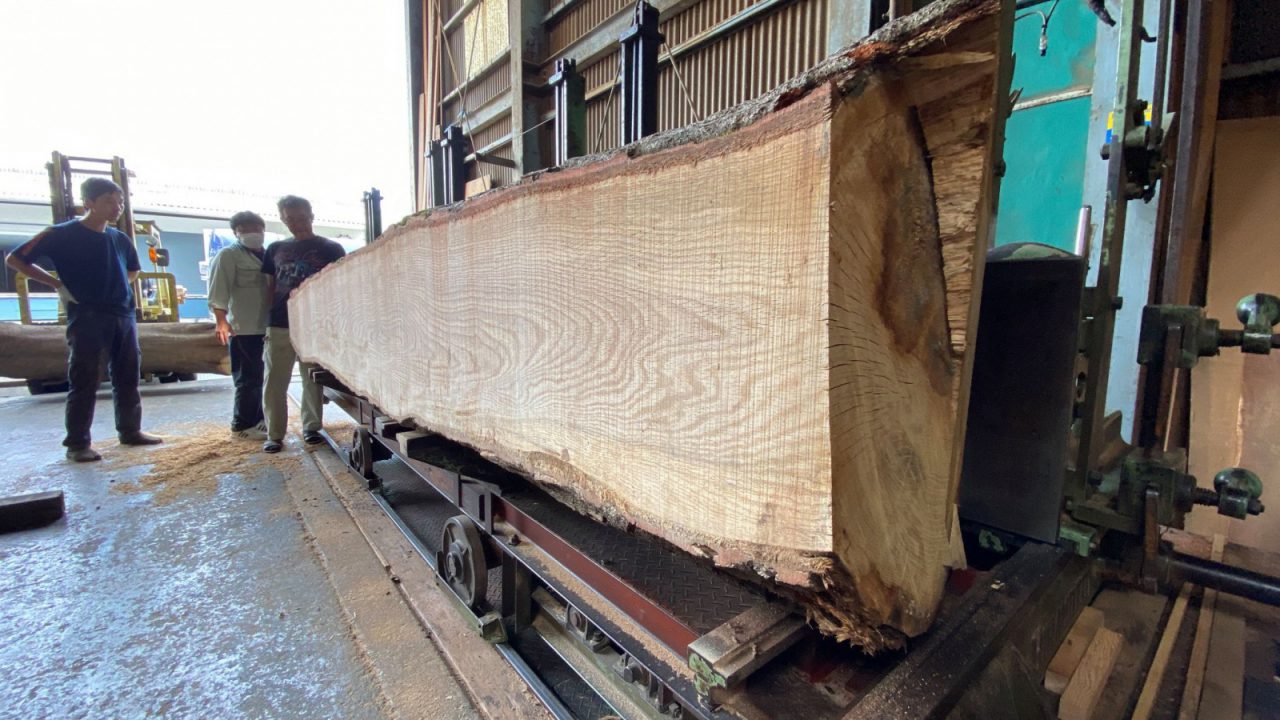 実は工務店で長く仕事をする私自身、広葉樹の製材を目の当たりにするのは初めてで、その迫力に大興奮!私よりはるかに永き年月を生きてきた木を伐採、製材することには強く感じるものありました。やっぱり活かせるものは大切に活かしていきたい!そう肌身で感じました。