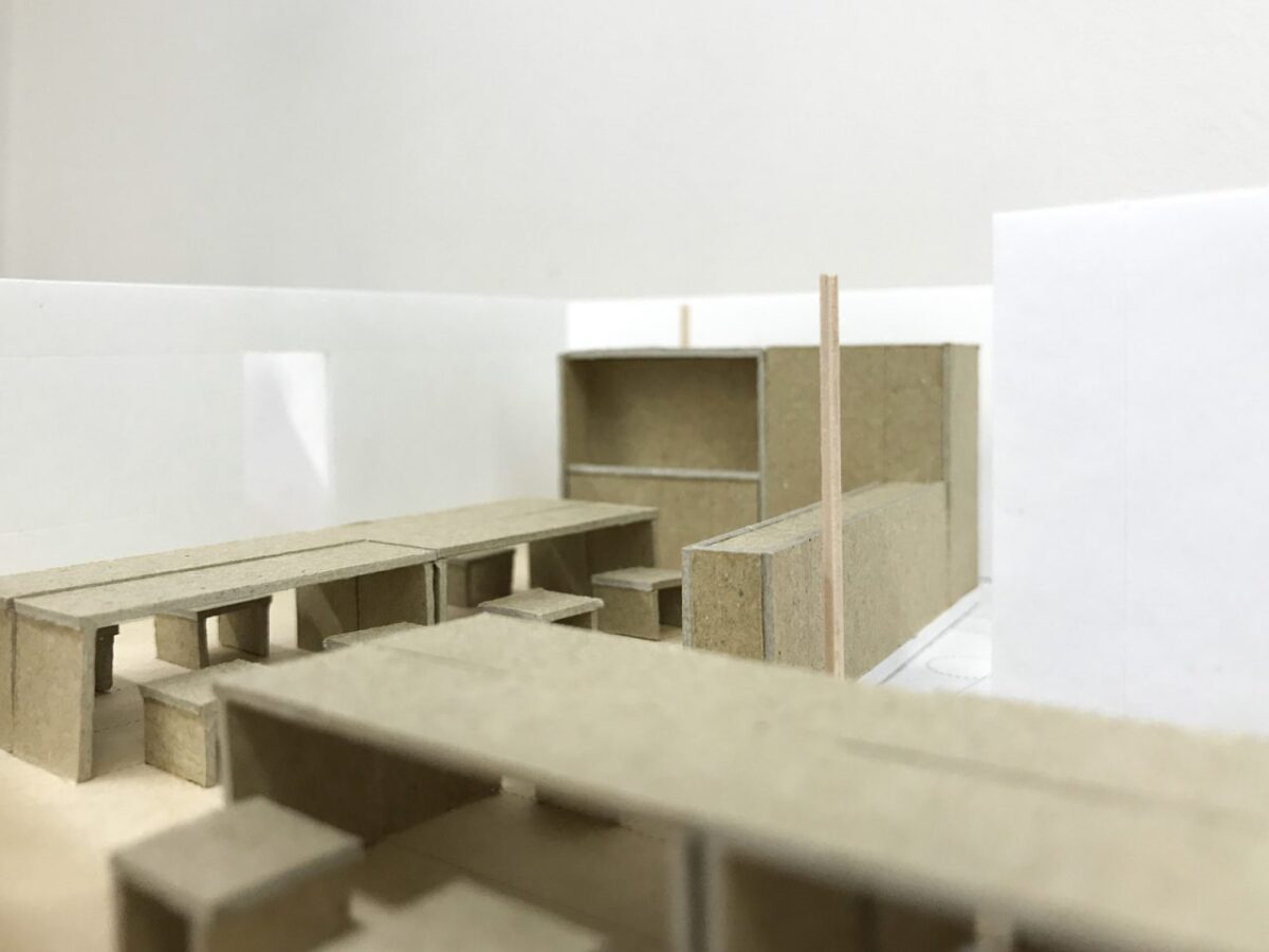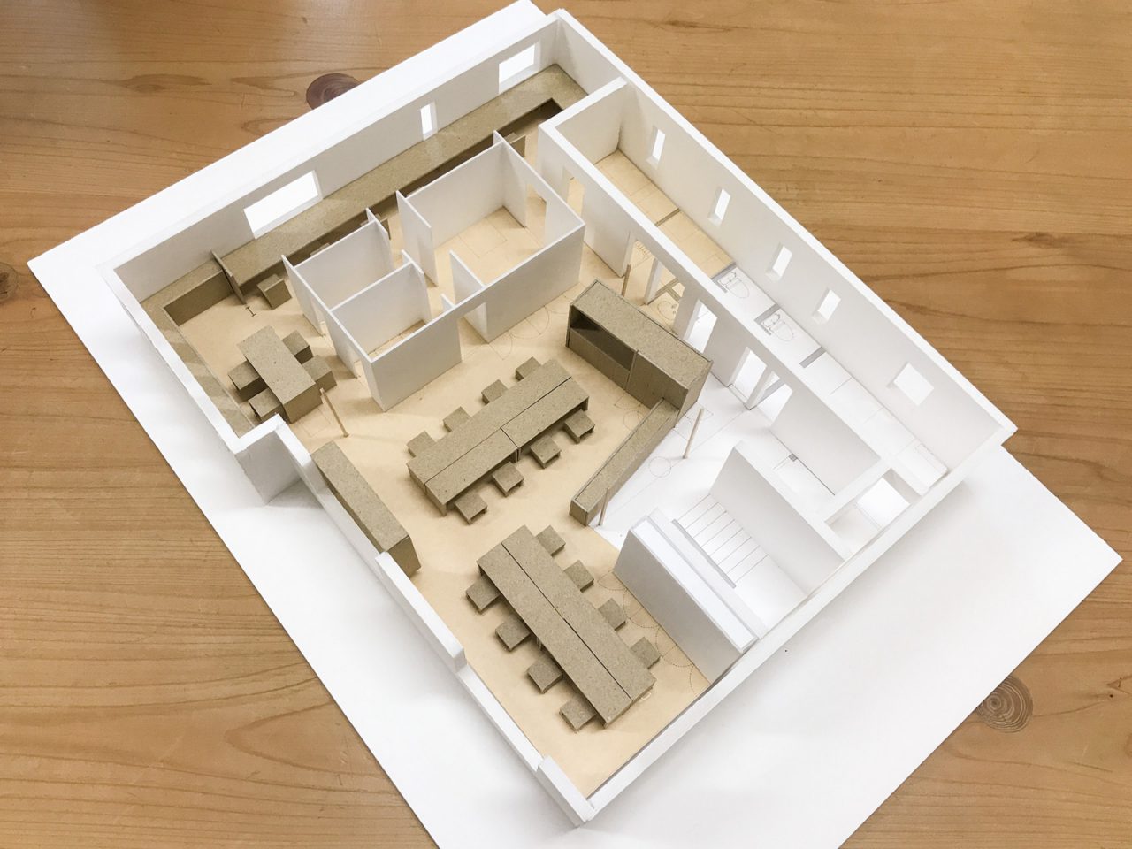 2階のオフィススペースの設計は相羽建設の松本翔平が計画中。受付部分を斜めに振るという小泉さんのアイディアから、模型もつくりながら検証を進めています!