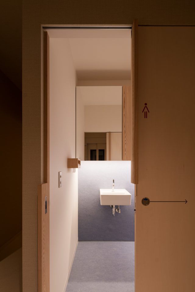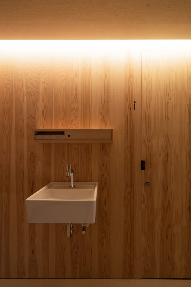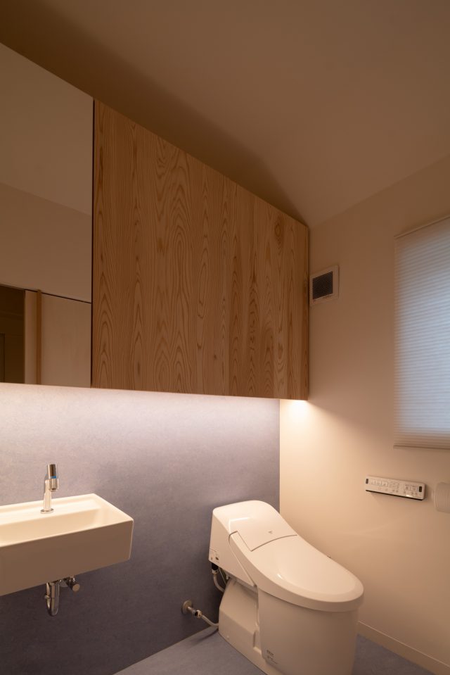 3階の女性用トイレは吊り戸棚の下に設置されたライトのみで空間を照らしています。