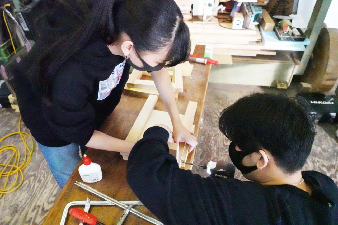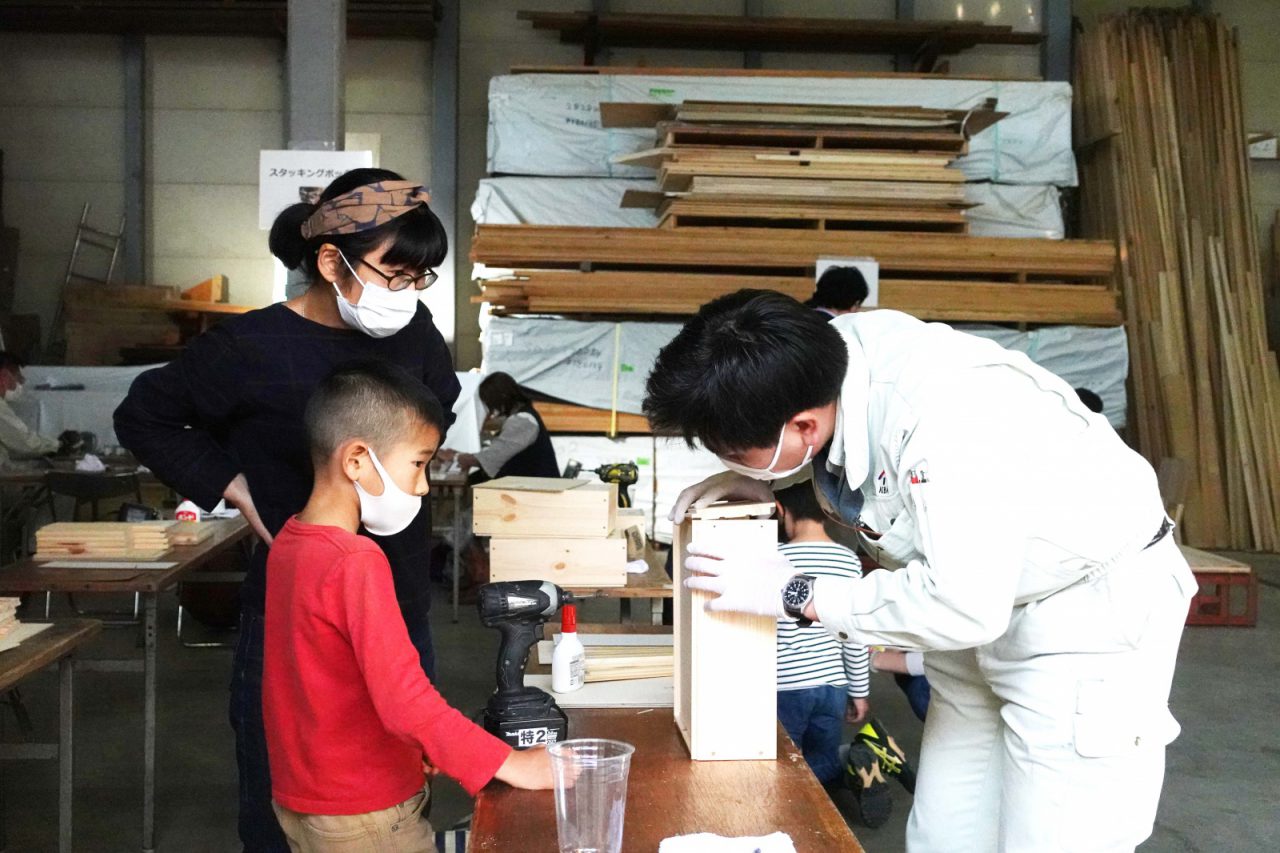 普段は大工さんが作業している加工場が、ものづくり会場に。人気のワークショップに加え、大工の考案した端材を使ったワークショップも開かれました。