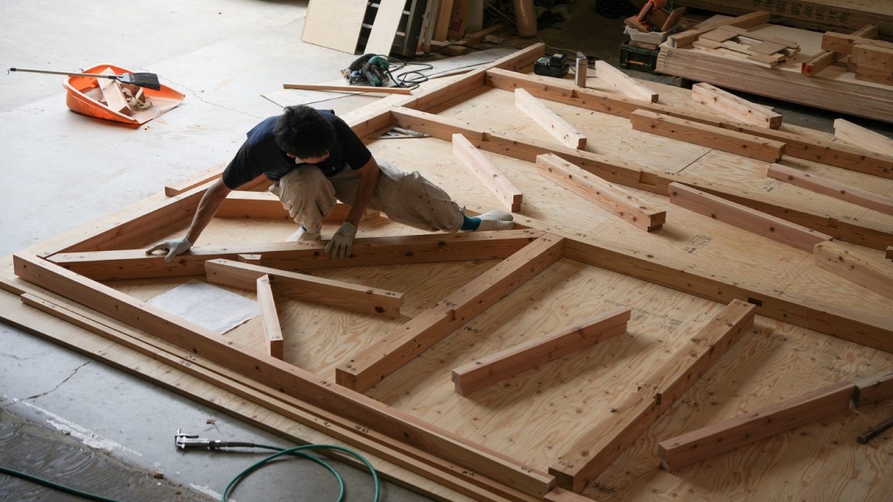 通り沿いから見た時に小屋のように見えるイメージで小泉誠さんがデザインしてくださった、ちょっと変わった斜め屋根の下屋。上棟後、加工場では棟梁の小林優太さんが下屋の屋根の地組みをして、現場監督の渡邉さんと確認作業をされていました。