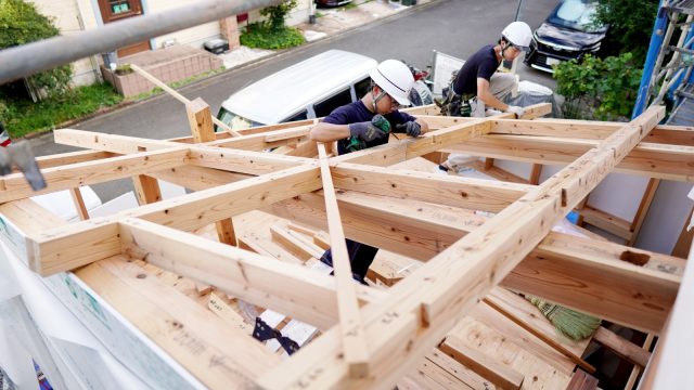 後日、現場で実際に屋根の木組が行われました。家の完成後はかくれてしまうのがもったいないくらいの立派な木組みの屋根ができあがりました。
