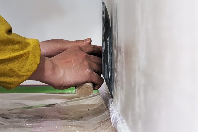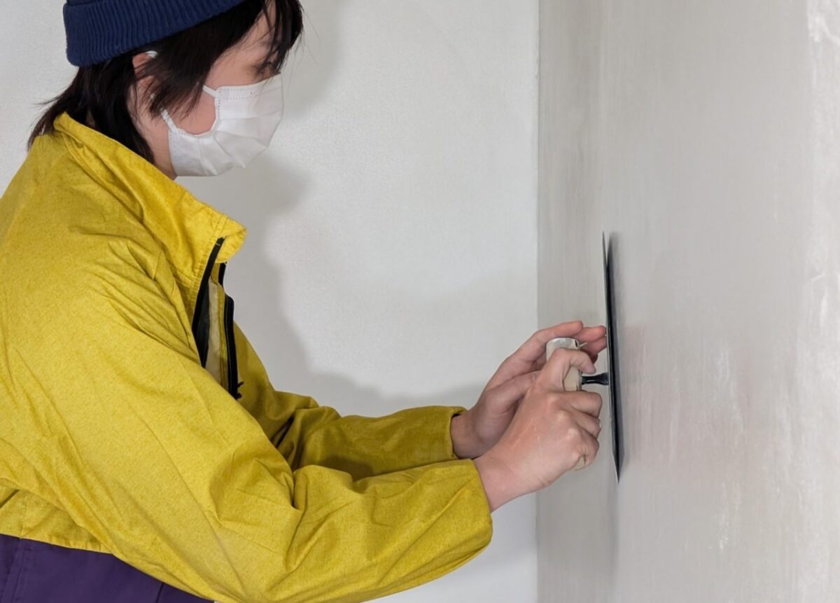 二層目の仕上げは、圧力を均一にかけ、コテをまっすぐ横に引いて仕上げます。息を止めて集中!とても緊張する作業でした。
