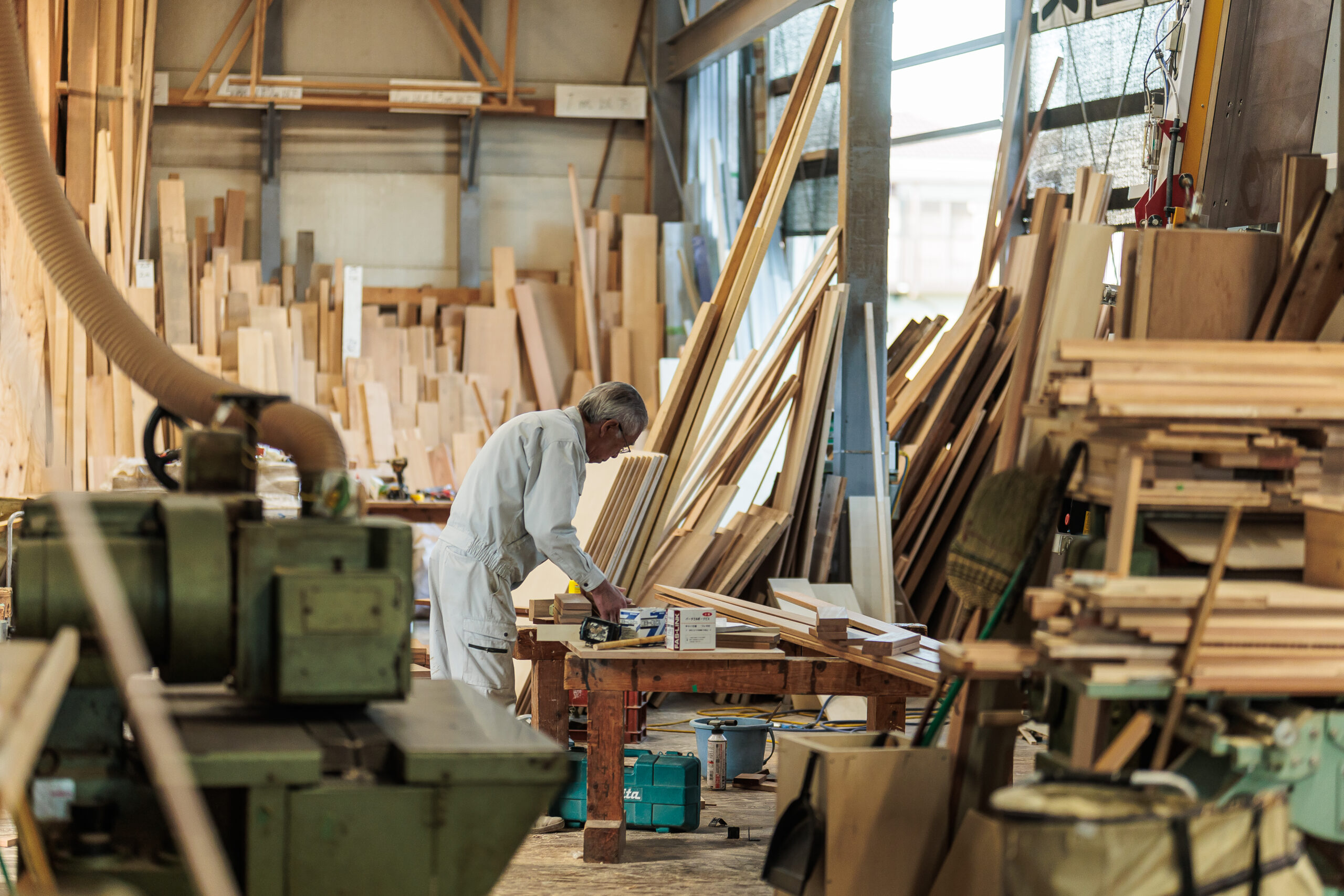 職人さん、大工さん、現場監督を中心とした、家づくりの“仕込み”をする拠点です。ものづくりイベント「手しごとフェスタ」や「こども工務店」のイベント会場としても活用しています。整理整頓・安全第一。