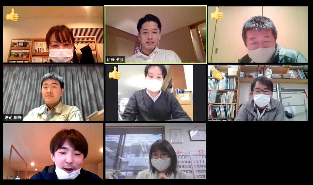 写真は来週はじめの「全社員勉強会」をオンラインで行うためのリハーサルの様子。新築住宅事業部のリーダーの中村さんが呼びかけて、つむじやあいばこ、事務所、自宅などそれぞれ別の場所から情報をオンラインで話をしてみました。