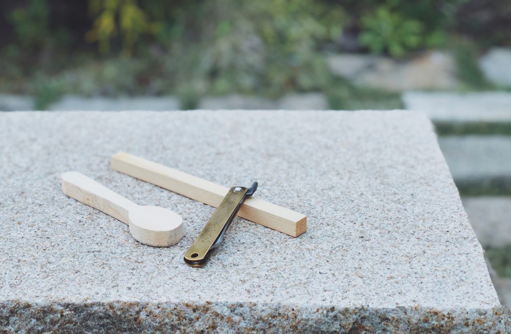 写真は夏のクラフト体験イベント「手しごとフェスタ」でこれまでにつくった木のスプーンやバターナイフの材料。
