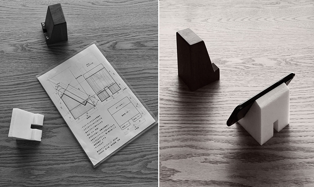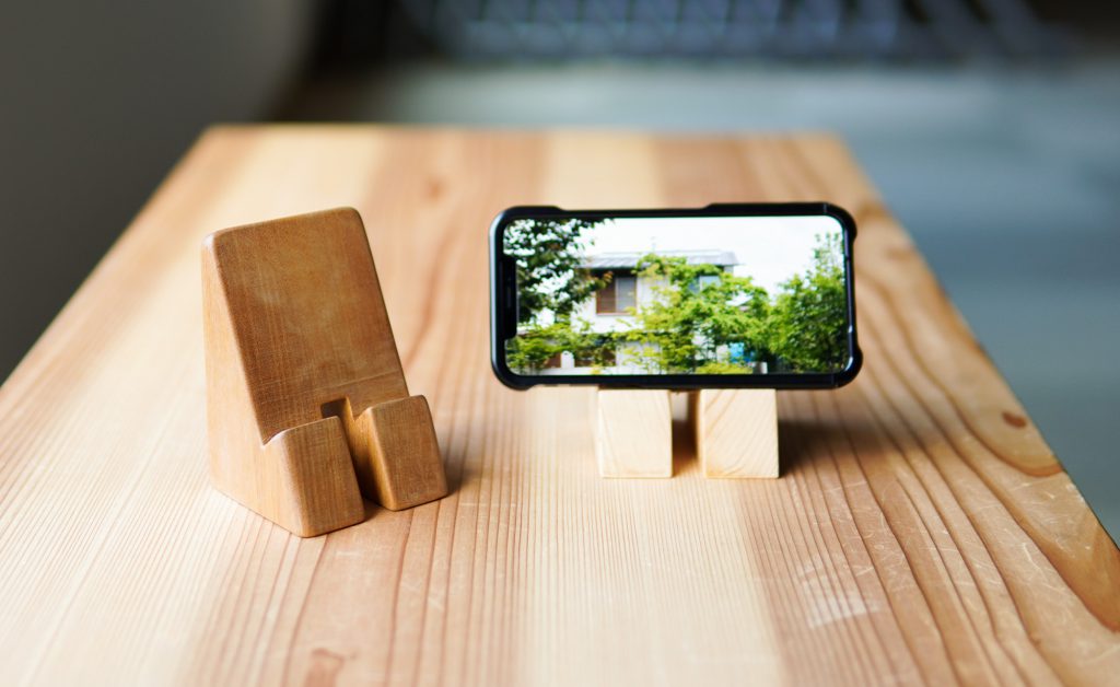 相羽建設でも、「withコロナの今だからこそ、工務店ができることは何だろう」とスタッフみんなで考えていました。その中で、現場監督の荻野さんが「テレワーク×大工さんの仕事を創出」というアイディアで木製のiPhoneスタンドを考案しました。家で仕事をしたり、離れた友人や家族とのコミュニケーションとしてオンライン会議が急速に広まる中で、スマートフォンを立てた状態で使える「スタンド」が必要になるはず、と。