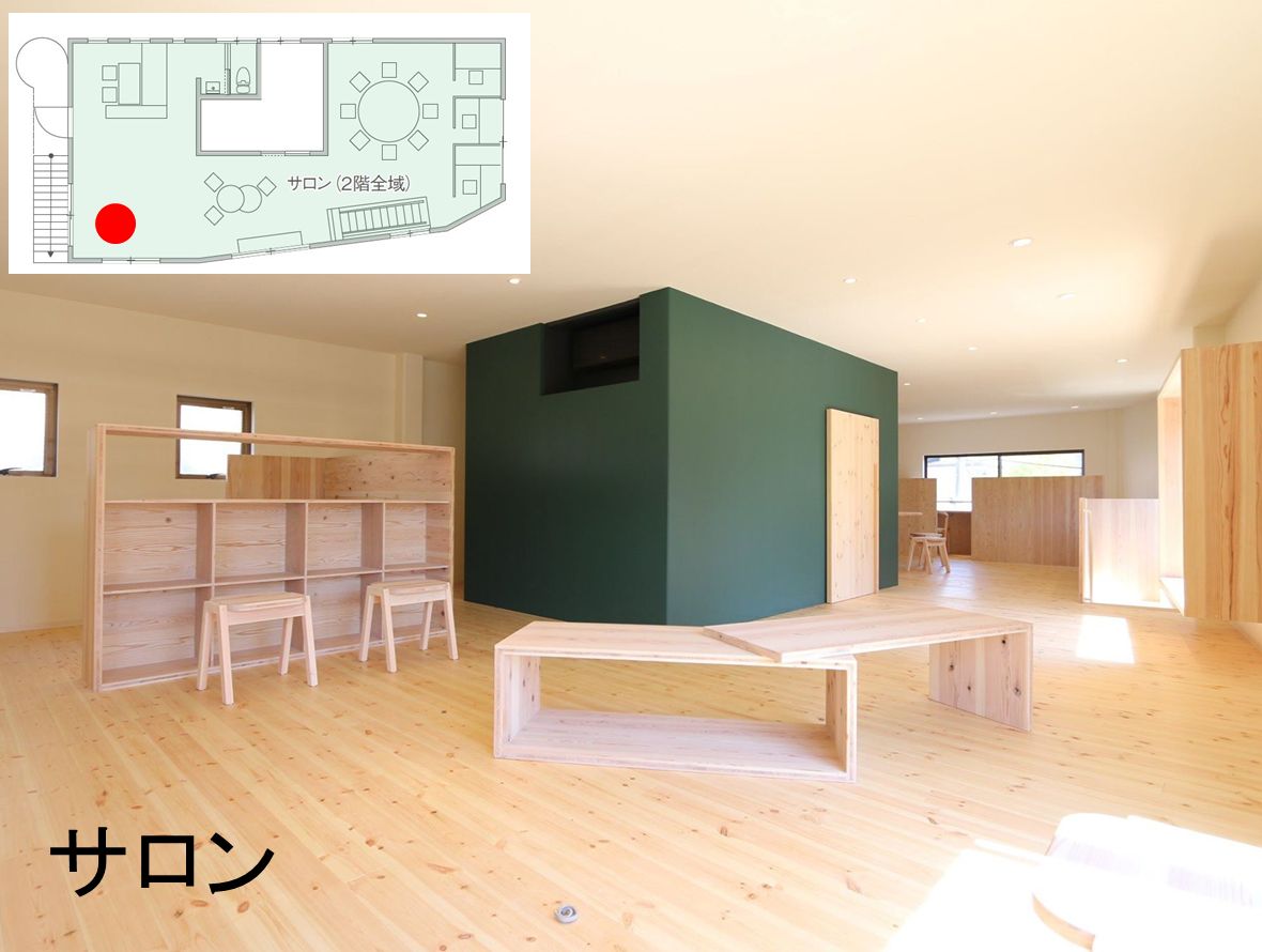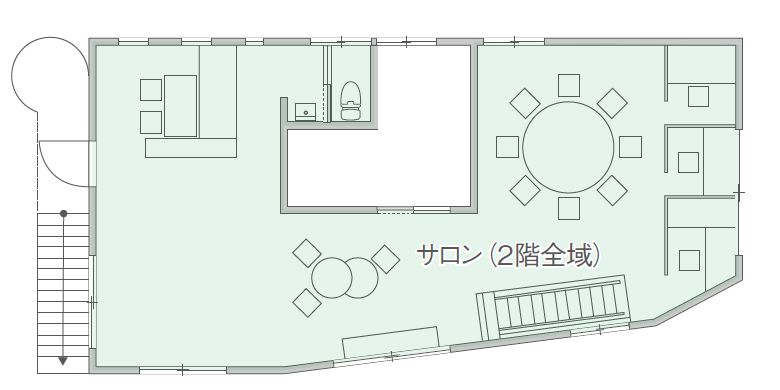 二階は、半個室×3・大テーブル・籠もりスペースがあります。多目的に利用できる「サロン」になっています。