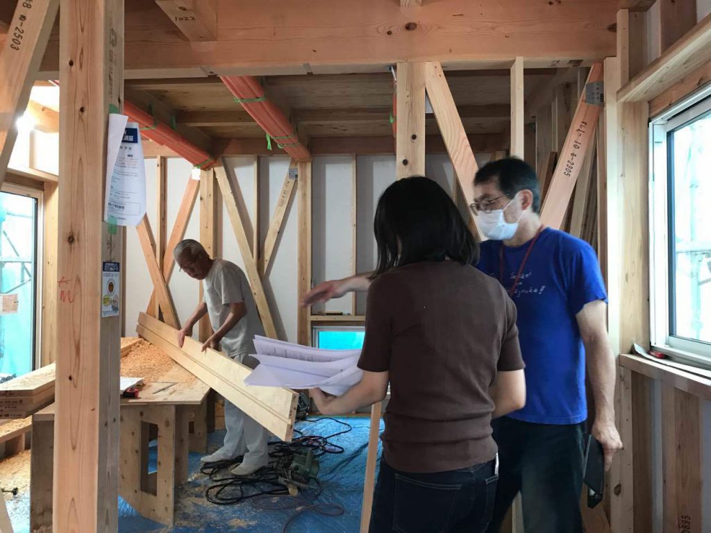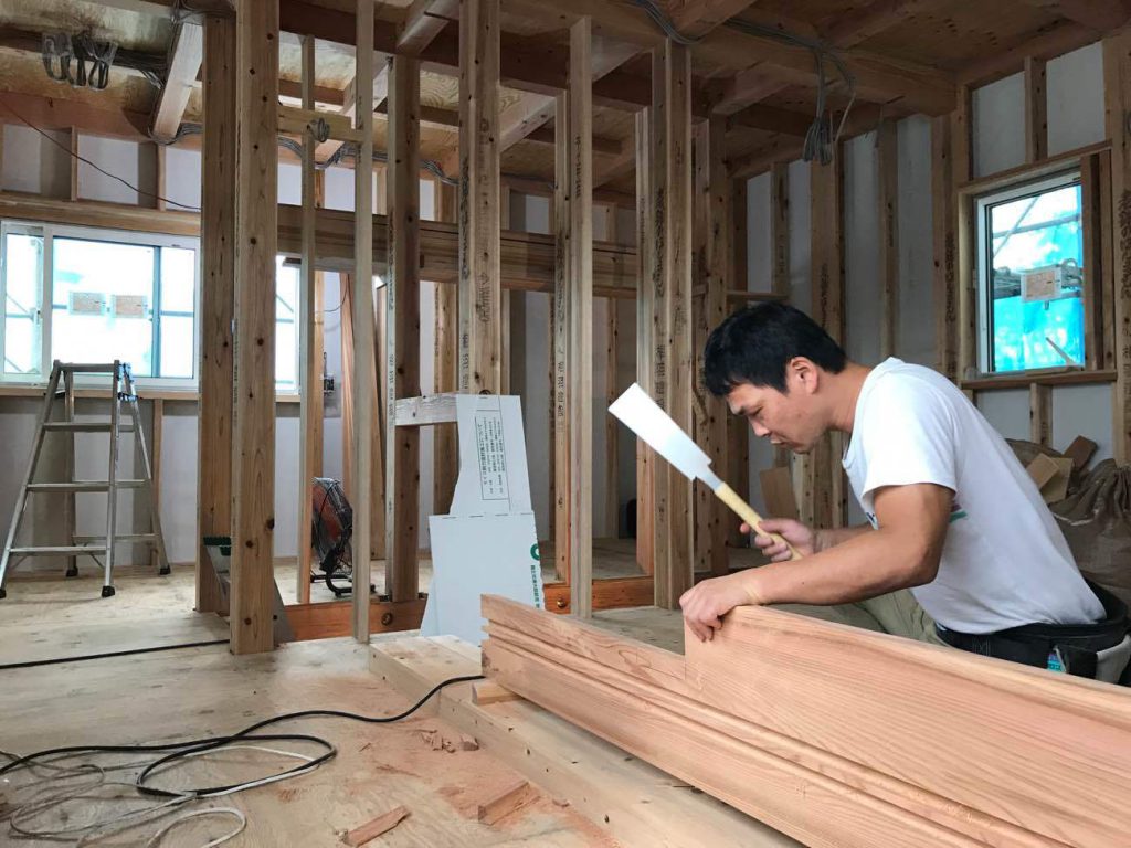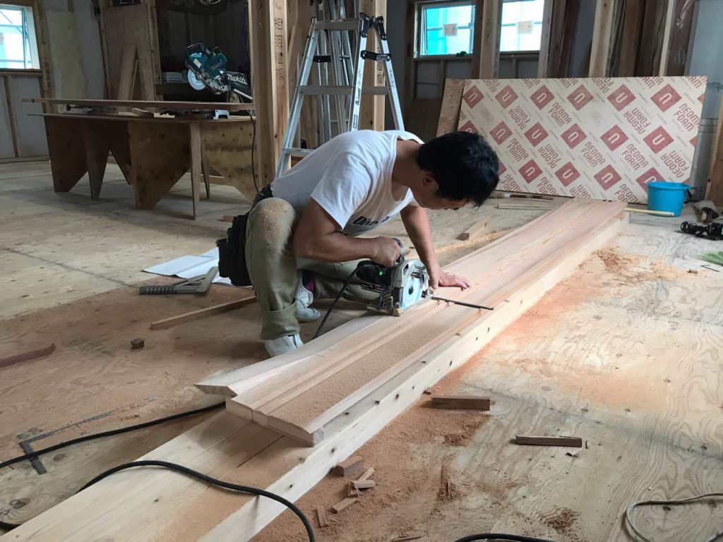 現場では山本大工が2階の木製建具枠の施工を手掛けていました。